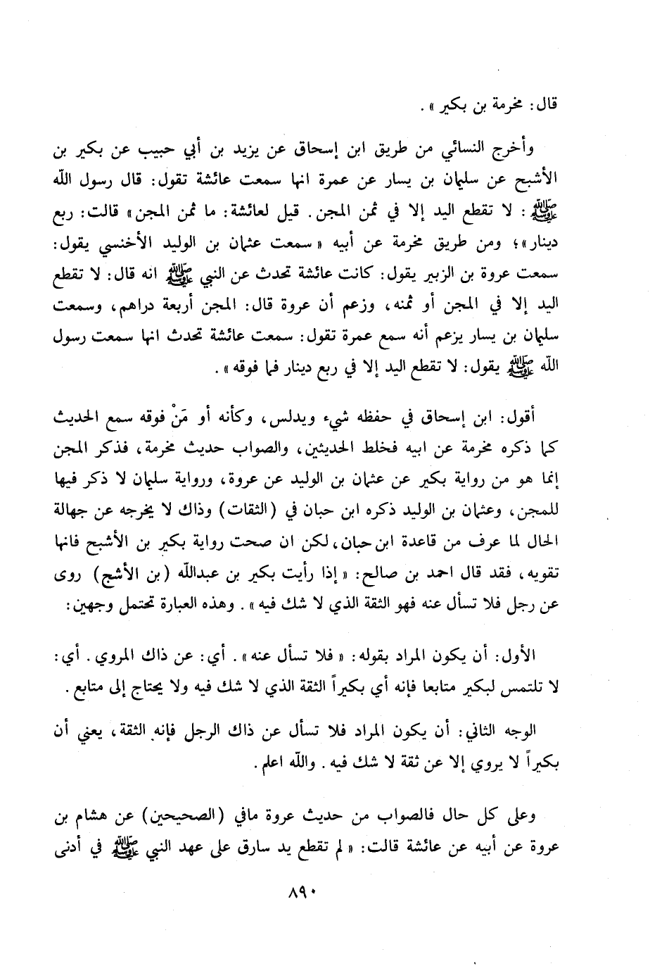 واخرج النسائي من طريق ابن اسحاق عن يزيد بن أبي حبيب عن بكير بن الأشج عن سليمان بن يسار عن عمرة انها سمعت عائشة تقول: قال رسول الله - صلى الله عليه وسلم -: لا تقطع اليد الا في ثمن المجن. قيل لعائشة: ما ثمن المجن؟ قالت: ربع دينار» . ومن طريق مخرمة عن أبيه «سمعت عثمان بن الوليد الأخنسي يقول، سمعت عروة بن الزبير يقول: كانت عائشة تحدث عن النبي - صلى الله عليه وسلم - انه قال: لا تقطع اليد الا في المجن اوثمنه، وزعم ان عروة قال: المجن اربعة دراهم. وسمعت سليمان بن يسار يزعم انه سمع عمرة تقول: سمعت عائشة تحدث أنها سمعت رسول الله - صلى الله عليه وسلم - يقول: لا تقطع اليد إلا في ربع دينار فما فوقه» .