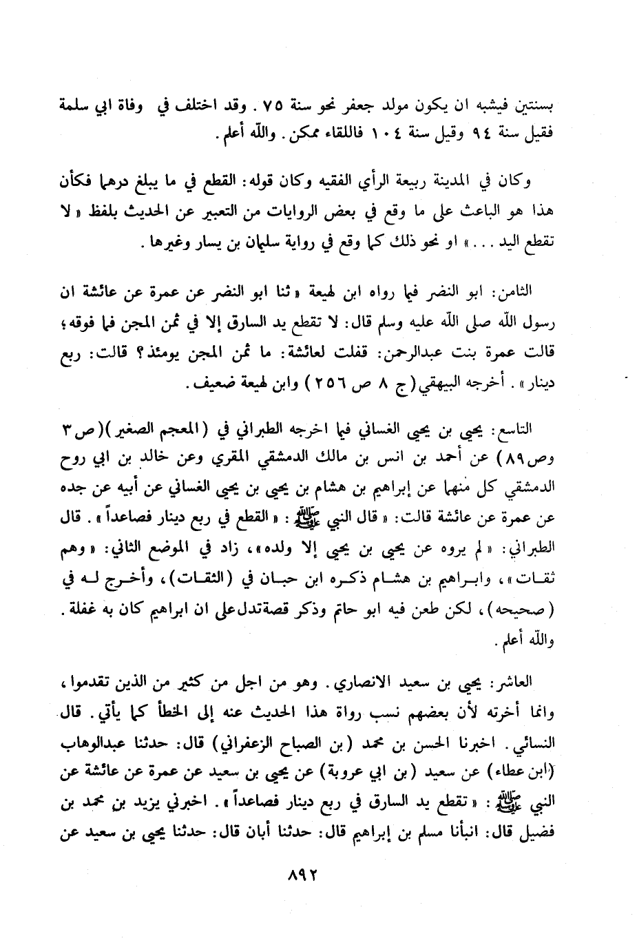 العاشر: يحيى بن سعيد الانصاري. وهو من أجل من كثير من الذين تقدموا، وإنما أخرته لأن بعضهم نسب رواة هذا الحديث عنه الى الخطأ كما يأتي. قال النسائي: «أخبرنا الحسن بن محمد (بن الصباح الزعفراني) قال: حدثنا عبد الوهاب (بن عطاء) عن سعيد (بن أبي عروبة) عن يحيى بن سعيد عن عمرة عن عائشة عن النبي - صلى الله عليه وسلم -: «تقطع يد السارق في ربع دينار فصاعداً» .أخبرني يزيد بن محمد بن فضيل قال: أنبأنا مسلم بن إبراهيم قال: حدثنا أبان قال: حدثنا يحيى بن سعيد عن