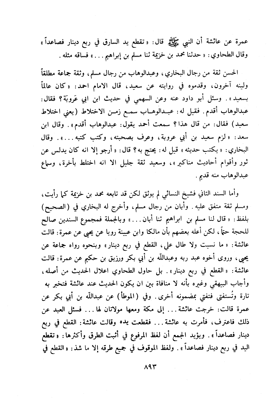وأما السند الثاني فشيخ النسائي لم يوثق ولكن قد تابعه محمد بن خزيمة كما رأيت، ومسلم ثقة متفق عليه. وأبان من رجال مسلم. واخرج له البخاري في (الصحيح) بلفظ: «قال لنا مسلم بن إبراهيم ثنا أبان ... » وبالجملة فمجموع السندين صالح للحجة حتماً. لكن اعله بعضهم بأن مالكاً وابن عيينة رويا عن يحيى عن عمرة: قالت عائشة: «ما نسيت ولا طال علي، القطع في ربع دينار» وبنحوه رواه جماعة عن يحيى، وروى أخوه عبد ربه وعبد الله بن أبي بكر ورزيق بن حكيم عن عمرة: قالت عائشة: «القطع في ربع دينار» . بل حاول الطحاوي إعلال من أصله، وأجاب البيهقي وغيره بأنه لا منافاة بين أن يكون الحديث عند عائشة فتخبر به تارة وتستفتى فتفتي بمضمونه أخرى. وفي (الموطأ) عن عبد الله ابن أبي بكر عن عمرة قالت: «خرجت عائشة ... إلى مكة ومعها مولاتان لها ... فسئل العبد عن ذلك فأعترف، فأمرت به عائشة ... فقطعت يده وقالت عائشة: القطع في ربع دينار فصاعداً ويؤيد الجمع أن لفظ المرفوع في أثبت الطرق وأكثرها: «تقطع اليد في ربع دينار فصاعداً» . ولفظ الموقوف في جميع طرقه إلا ما شذ: «القطع في