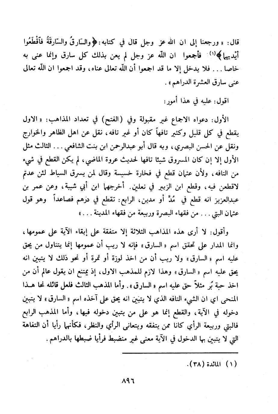 الأول: دعواه الإجماع غير مقبولة وفي (الفتح) في تعداد المذاهب: «الأول يقطع في كل قليل وكثير تافهاً كان أو غير تافه، نقل عن أهل الظاهر والخوارج ونقل عن الحسن البصري، وبه قال أبو عبد الرحمن أبن بنت الشافعي ... . الثالث مثل الأول إلا إن كان المسروق شيئاً تافهاً لحديث عروة الماضي. لم يكن القطع في شيء من التافه، ولأن عثمان قطع في فخارة خسيسة وقال لمن يسرق السياط لئن عدتم لأقطعن فيه، وقطع أبن الزبير في نعلين. أخرجها أبن أبي شيبة. وعن عمر بن عبد العزيز أنه في مد أو مدين. الرابع: تقطع في درهم فصاعداً وهو قول عثمان البتي ... من فقهاء البصرة وربيعة من فقهاء المدينة ... » .