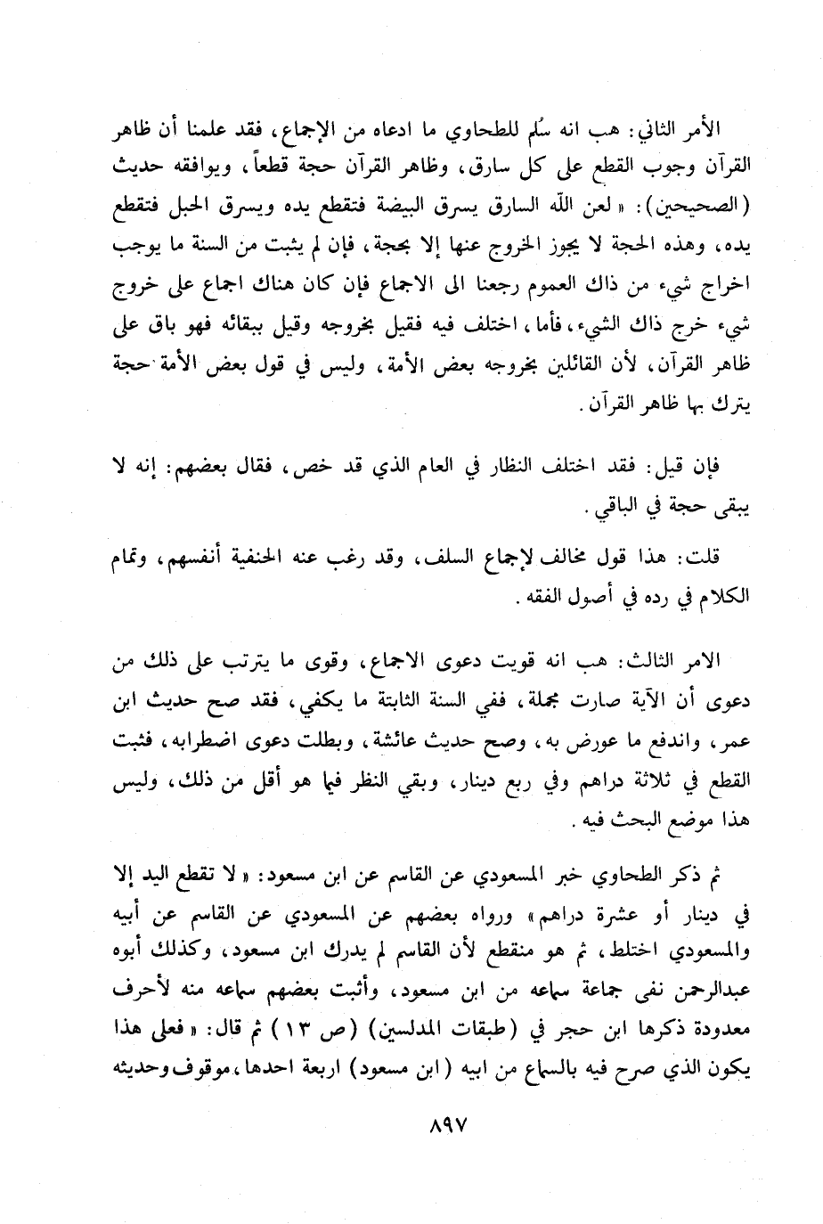 الأمر الثاني: هب أنه سلم للطحاوي ما ادعاه من الإجماع، فقد علمنا أن ظاهر القرآن وجوب القطع على كل سارق، وظاهر القرآن حجة قطعاً، ويوافقه حديث (الصحيحين) : «لعن الله السارق يسرق البيضة فتقطع يده ويسرق الحبل فتقطع يده» ، وهذه الحجة لا يجوز الخروج عنها إلا بحجة، فإن لا يثبت من السنة ما يوجب إخراج شيء من ذاك العموم رجعنا إلى الإجماع فإن كان هناك إجماع على خروج شيء، فأما ما أختلف فيه فقيل بخروجه وقيل ببقائه فهو باق على ظاهر القرآن، لأن القائلين بخروجه بعض الأمة، وليس في قول بعض الأمة حجة يترك بها ظاهر القرآن.