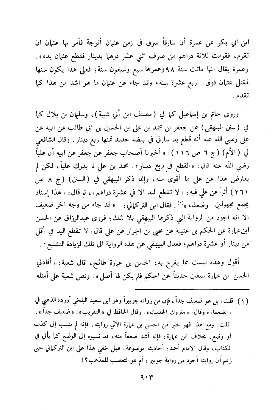 وروى حاتم بن إسماعيل كما في (مصنف ابن أبي شيبة) ، وسليمان بن هلال كما في (سنن البيهقي) عن جعفر بن محمد بن علي بن الحسين بن أبي طالب عن أبيه عن علي رضي الله عنه أنه قطع يد سارق في بيضة حديد ثمنها ربع دينار. وقال الشافعي في (الأم) ج 6 ص 116: «أخبرنا أصحاب جعفر عن جعفر عن أبيه أن علياً رضي الله عنه قال: «القطع في ربع دينار» . محمد بن علي لم يدرك علياً، لكن لم يعارض هذا عن علي ما هو أقوى منه، وإنما ذكر البيهقي (السنن) ج 8 ص 261 أثراً عن علي فيه: «لا تقطع اليد إلا في عشرة دراهم» ثم قال: «هذا إسناد يجمع مجهولين وضعفاء» (1) . فقال ابن التركماني: «قد جاء من وجه آخر ضعيف إلا أنه أجود من الرواية التي ذكرها البيهقي بلا شك. فروى عبد الرزاق عن الحسن بن عمارة عن الحكم بن عتيبة عن يحيى بن الجزار عن على قال: لا تقطع اليد في أقل من دينار أو عشرة دراهم. فعدل البيهقي عن هذه الرواية الى تلك لزيادة التشنيع» .