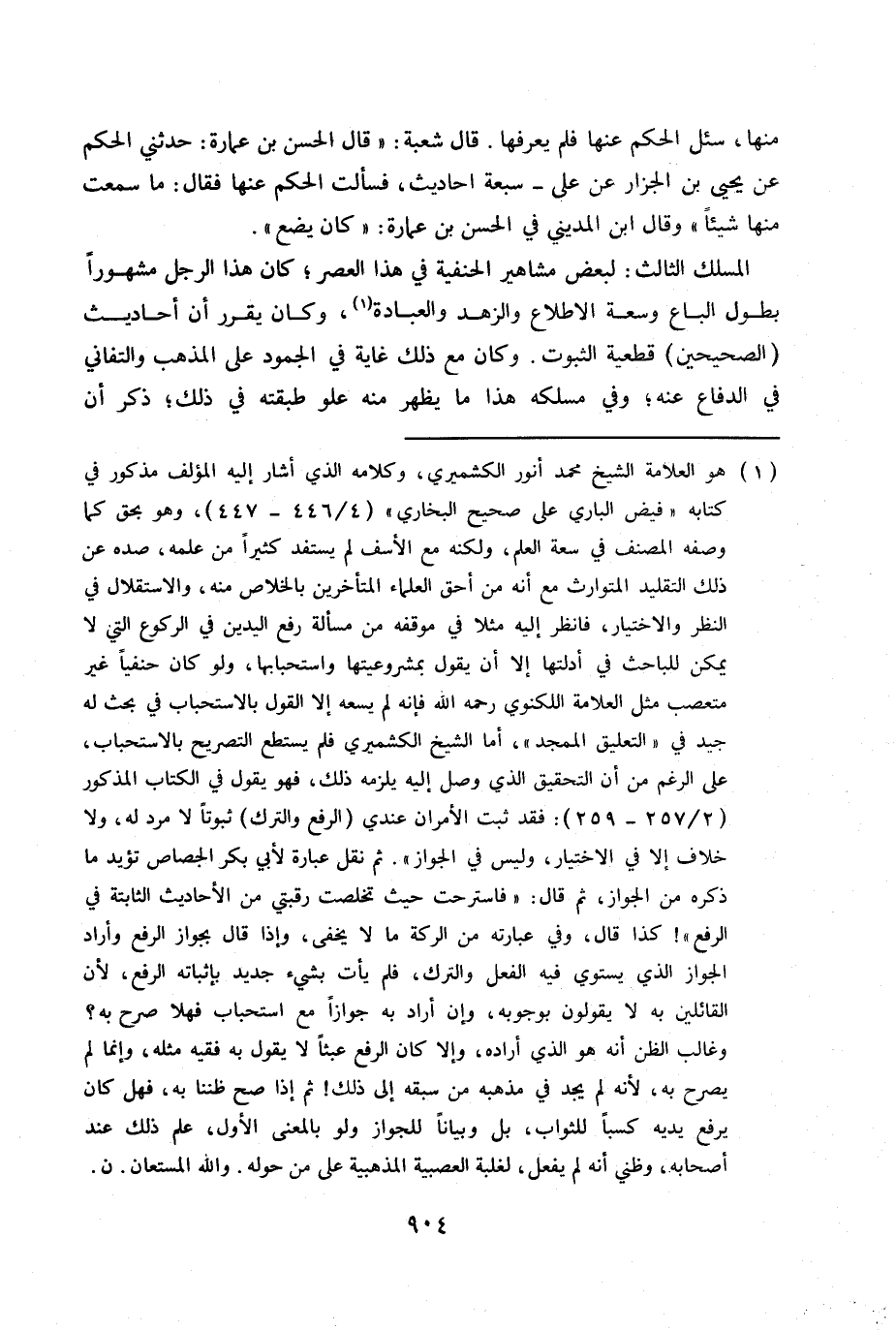 (1) هو العلامة الشيخ محمد أنور الكشميرى، وكلامه الذي أشار إليه المؤلف مذكور في كتابه «فيض البارى على صحيح البخاري» (4/446-447) ، وهو بحق كما وصفه المصنف في سعة العلم، ولكنه مع الأسف لم يستفد كثيراً من علمه، صده عن ذلك التقليد المتوارث مع أنه من أحق العلماء المتأخرين بالخلاص منه، والاستقلال في النظر والاختيار، فانظر إليه مثلا في موقفه من مسألة رفع اليدين في الركوع التي لا يمكن للباحث في أدلتها إلا أن يقول بمشروعيتها واستحبابها، ولو كان حنيفاً غير متعصب مثل العلامة اللكنوي رحمه الله فإنه لم يسعه إلا أن يقول بمشروعيتها واستجابها في بحث له جيد في «التعليق الممجد» ، وأما الشيخ الكشميرى فلم يستطع التصريح بالاستحبات، على الرغم من أن التحقيق الذي وصل إليه يلزمه ذلك، - فهو يقول في الكتاب المذكور (2/257-259) : فقد ثبت الأمران عندي (الرافع والترك) ثبوتاً لا مرد له، ولا خلاف إلا في الاختيار، وليس في الجواز» . ثم نقل عبارة لأبي بكر الجصاص تؤيد ما ذكره من الجواز، ثم قال: «فاسترحت حيث تخلصت رقبتي من الأحاديث الثابتة في الرفع» ! كذا قال، وفي عبارة من الركعة ما لا يخفى، وإذا قال بجواز الرفع وأراد الجواز الذي يستوى فيه الفعل والترك، فلم يأت بشيء جديد بإثباته الرفع، لأن القائلين به لايقولون بوجوبه، وإن أراد به جوازاً مع استحباب فهلا صرح به؟ لأنه لم يجد في مذهبه من سبقه إلى ذلك! ثم إذا صح ظننا به، فهل كان يرفع يديه كسباً للثواب، بل وبياناً للجواز ولو بالمعنى الأول، علم ذلك عند أصحابه، وظني أنه لم يفعل، لغلبه العصبية المذهبية على من حوله. والله المستعان. ن