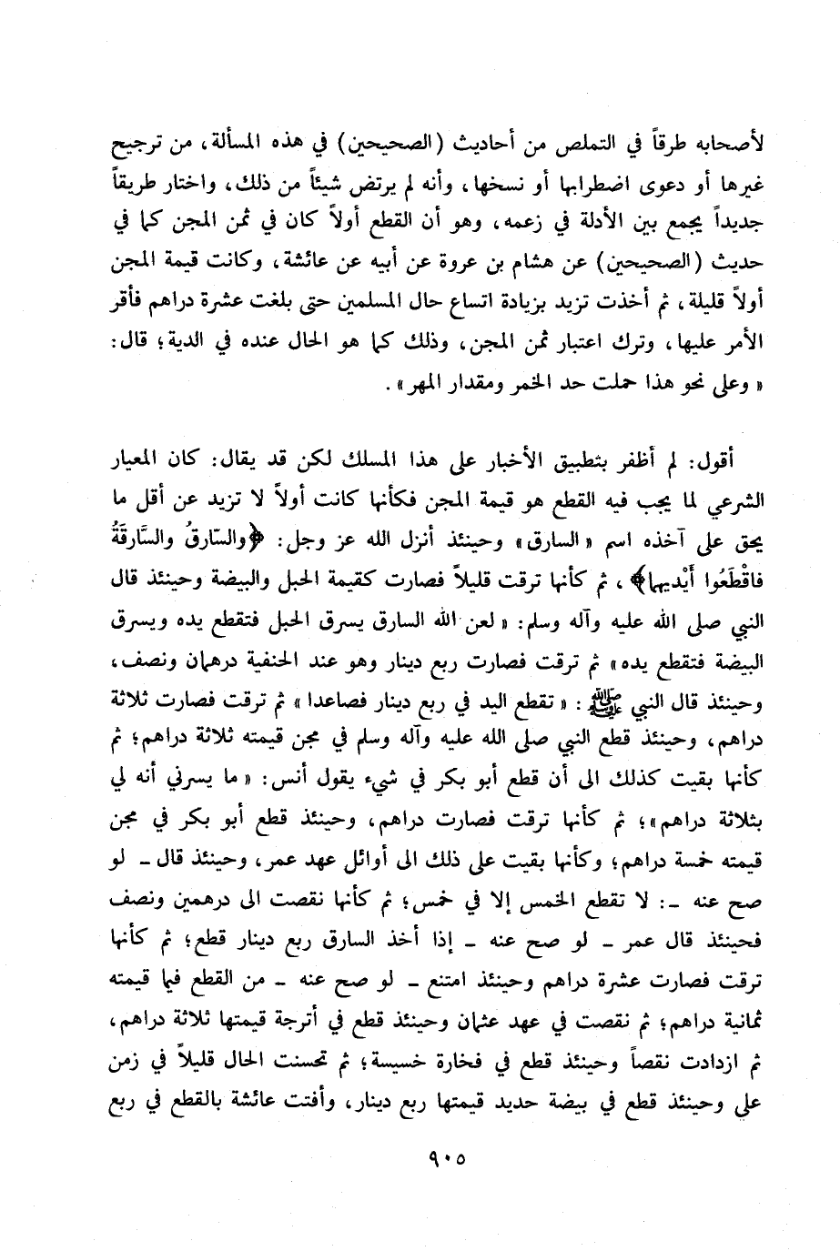 لأصحابه طرقاً في التملص من أحاديث (الصحيحين) في هذهالمسألة، من ترجيح غيرها أو دعوى اضطرابها أو نسخها، وأنه لم يرتض شيئاً من ذلك، واختار طريقاً جديداً يجمع بين الادلة في زعمه، وهو أولاً كان في ثمن المجن كما في حديث (الصحيحين) عن هشام بن عروة عن أبيه عن عائشة، وكانت قيمة المجن أولاً قليلة، ثم أخذت تزيد بزيادة أتساع حال المسلمين حتى بلغت عشرة دراهم فأقر الأمر عليها، وترك اعتبار ثمن المجن، وذلك كما هو الحال عنده في الدية. قال: «وعلى نحوهذا حملت حد الخمر ومقدار المهر» .