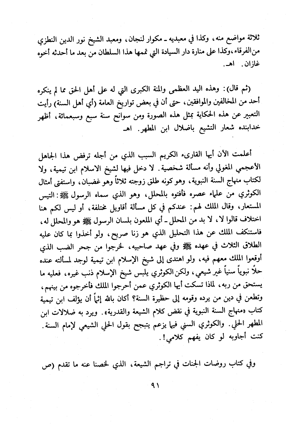 الطلاق الثلاث في عهده - صلى الله عليه وسلم - وفي عهد صاحبيه، لخرجوا من جحر الضب الذي أوقعوا الملك معهم فيه، ولو اهتدى إلى شيخ الإسلام ابن تيمية لوجد لمسألته عنده حلاً نبوياً سنياً غير شيعي، ولكن الكوثري يلبس شيخ الإسلام ذنب غيره، فعليه ما يستحق من ربه، لماذا تسكت أيها الكوثري عمن أحرجوا الملك فأخرجوه من بينهم، وتطعن في دين من يرده وقومه إلى حظيرة السنة؟ أكان بالله إثماً أن يؤلف ابن تيمية كتاب "منهاج السنة النبوية في نقض كلام الشيعة والقدرية". ويرد به ضلالات ابن المطهر الحلي. والكوثري السني فيما يزعم يتبجح بقول الحلي الشيعي لإمام السنة.
