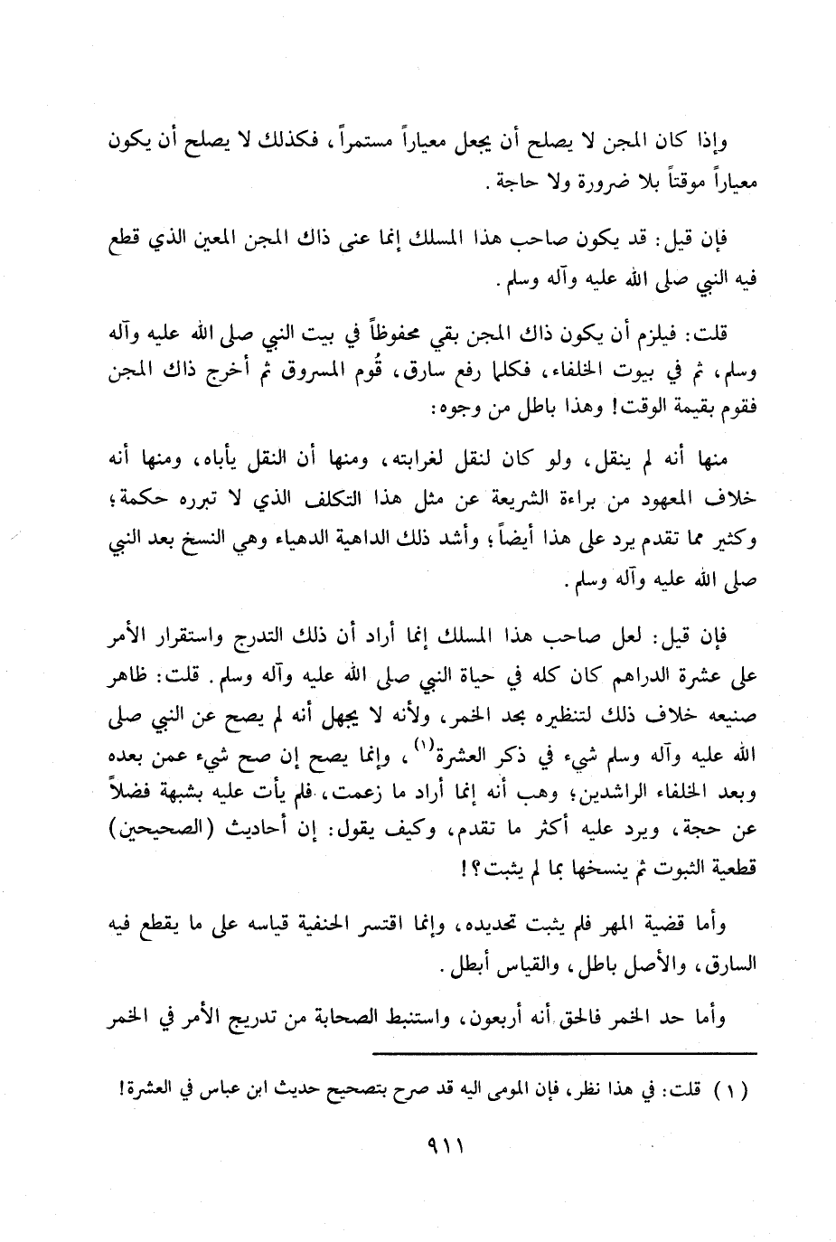 فإن قيل: لعل صاحب هذا المسلك إما أراد أن ذلك التدرج واستقرار الأمر على عشرة الدراهم كان كله في حياة النبي صلى الله عليه وآله وسلم. قلت ظاهر صنيعه خلاف ذلك لتنظيره بحد الخمر، ولأنه لا يجهل أنه لم يصح عن النبي صلى الله عليه وآله وسلم شيء في ذكر العشرة، (1) وإنما يصح إن صح شيء عمن بعده وبعد الخلفاء الراشدين. وهب أنه أراد ما زعمت، لم يأت عليه بشبهة فضلاً عن حجة، ويرد عليه أكثر ما تقدم. وكيف يقول: إن أحاديث (الصحيحين) قطعية الثبوت ثم ينسخها بما لم يثبت؟ !
