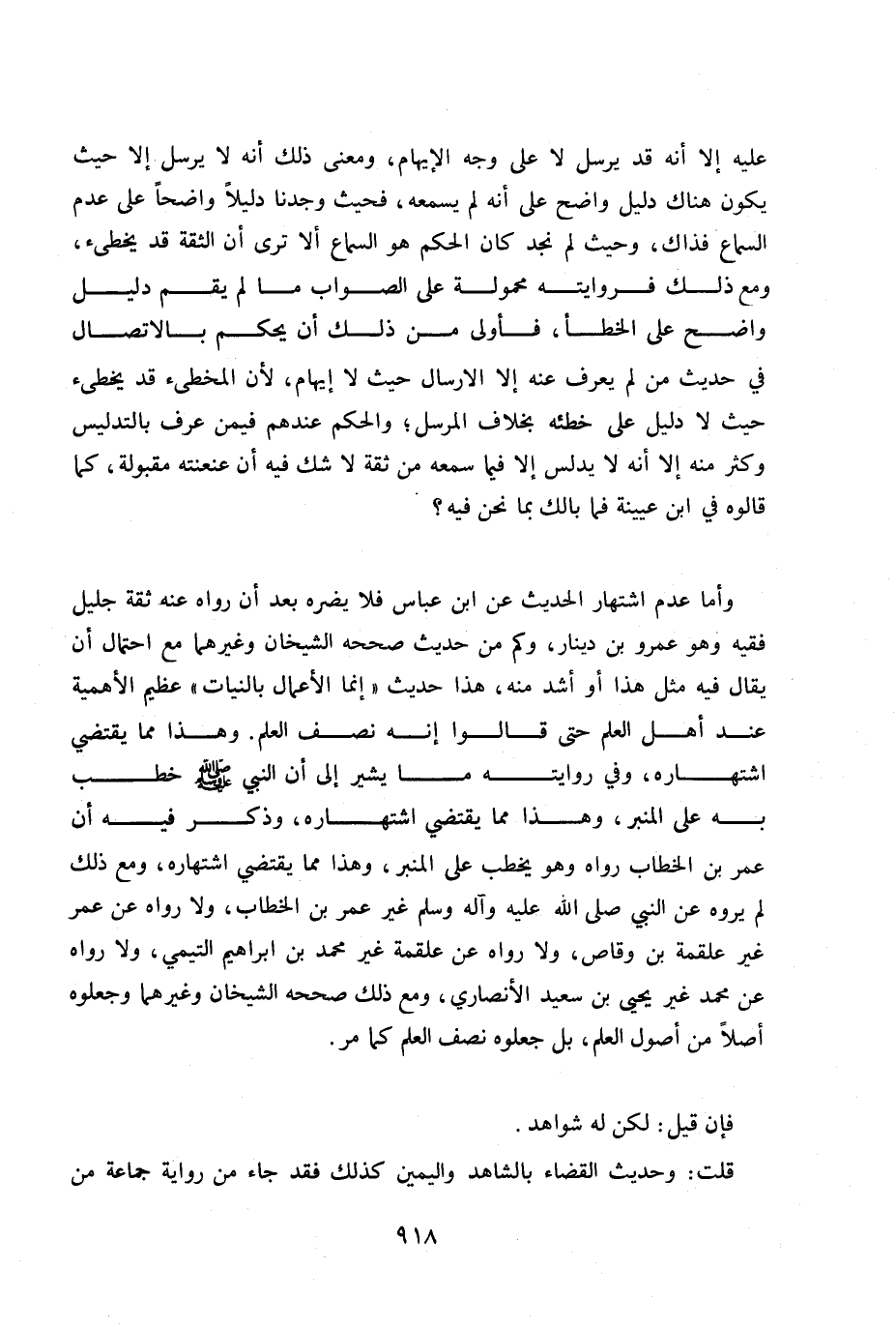 وأما عدم اشتهار الحديث عن ابن عباس فلا يضره بعد أن رواه عنه ثقة جليل فقيه وهو عمرو بن دينار، وكم من حديث صححه الشيخان وغيرهما مع احتمال أن يقال فيه مثل هذا أو أشد منه، هذا حديث «إنما الأعمال بالنيات» عظيم الأهمية عند أهل العلم حتى قالوا أنه نصف العلم. وهذا مما يقتضي اشتهاره، وفي روايته ما يشير إلى أن النبي صلى الله عليه وسلم خطب به على المنبر، وهذا مما يقتضي اشتهاره، وذكر فيه أن عمر بن الخطاب رواه وهو يخطب على المنبر، وهذا مما يقتضي اشتهاره، ومع ذلك لم يروه عن النبي صلى الله عليه وسلم غير عمر بن الخطاب، ولا رواه عن عمر غير علقمة بن وقاص، ولا رواه عن علقمة غير محمد بن إبراهيم التيمي، ولا رواه عن محمد غير يحيى بن سعيد الأنصاري، ومع ذلك صححه الشيخان وغيرهما وجعلوه أصلاً من أصول العلم، بل جعلوه نصف العلم كما مر.