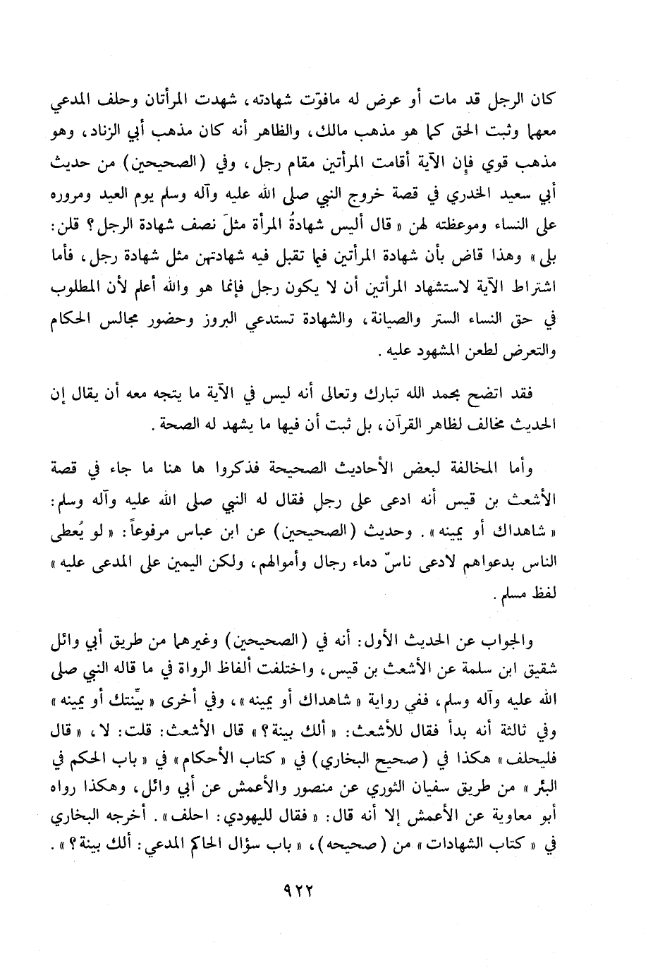 كان الرجل قد مات أو عرض له ما فوت شهادته، شهدت المرآتان وحلف المدعى معهما وثبت الحق كما هو مذهب مالك، والظاهر أنه كان مذهب أبي الزناد، وهو مذهب قوي فإن الآية أقامت المرأتين مقام الرجل، وفي (الصحيحين) من حديث أبي سعيد الخدري في قصة خروج النبي صلى الله عليه وآله وسلم يوم العيد ومروره على النساء وموعظته لهن «قال أليس شهادة المرأة مثل نصف شهادة الرجل؟ قلن: بلى» وهذا قاضٍ بأن شهادة المرأتين في ما تقبل فيه شهادتهن مثل شهادة رجل، فأما إشتراط الآية لاستشهاد المرأتين أن لا يكون رجل فإنما هو والله اعلم لأن المطلوب في حق النساء الستر والصيانة، والشهادة تستدعي البروز وحضور مجالس الحكام والتعرض لطعن المشهود عليه.
