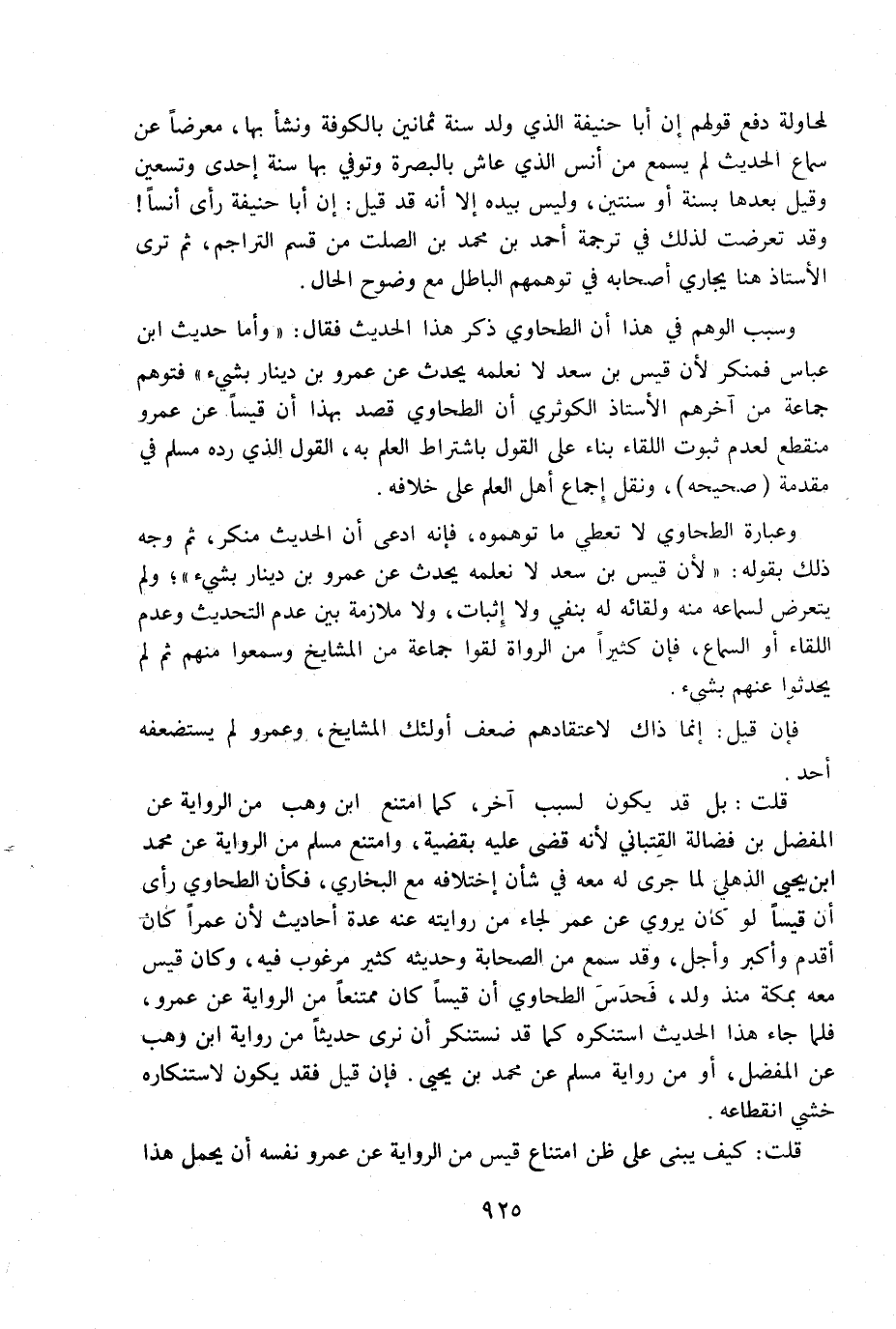 وعبارة الطحاوي لا تعطي ما توهموه، فإنه ادعى أن الحديث منكر، ثم وجه ذلك بقوله: «لأن قيس بن سعد لا نعلمه يحدث عن عمرو بن دينار بشيء» ولم يتعرض لسماعه منه ولقائه له بنفي ولا إثبات. ولا ملازمة بين عدم التحديث وعدم اللقاء أو السماع، فإن كثيراً من الرواة لقوا جماعة من المشايخ وسمعوا منهم ثم لم يحدثوا عنهم بشيء.