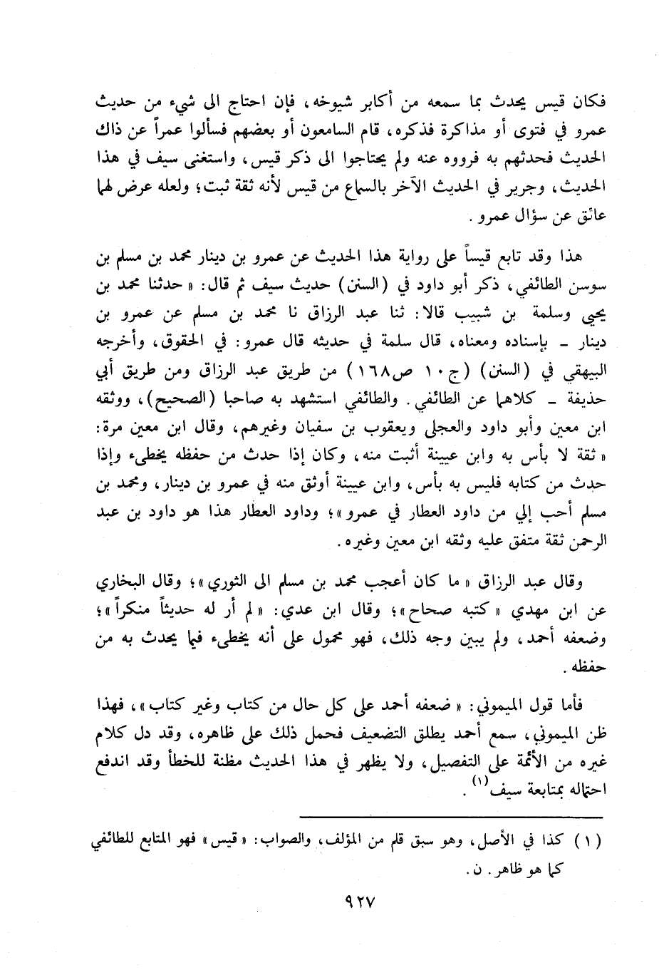 فأما قول الميموني: «ضعفه أحمد على كل حال من كتاب وغير كتاب» ، فهذا ظن الميموني، سمع أحمد يطلق التضعيف فحمل ذلك على ظاهره، وقد دل كلام غيره من الأئمة على التفصيل، ولا يظهر في هذا الحديث مظنة للخطأ وقد اندفع احتماله بمتابعة سيف. (1)