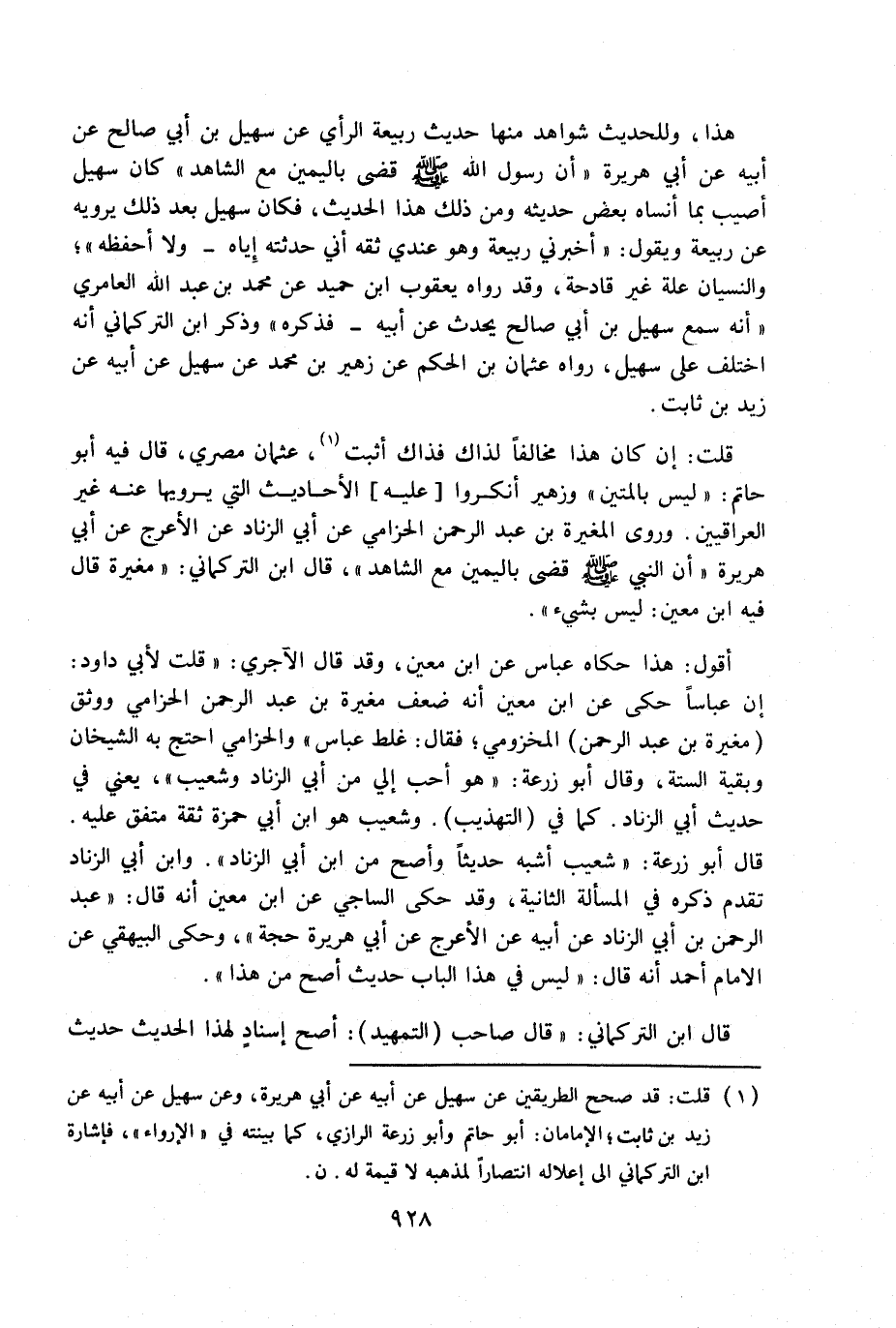 قلت: إن كان هذا مخالفاً لذاك فذاك أثبت، (1) عثمان مصري، قال فيه أبو حاتم: «ليس بالمتين» وزهير أنكروا «عليه» الأحاديث التي يرويها عنه غير العراقيين. وروى المغيرة بن عبد الرحمن الحزامي عن أبي الزناد عن الأعرج عن أبي هريرة «أن النبي - صلى الله عليه وسلم - قضى باليمين مع الشاهد» قال ابن التركماني: «مغيرة قال فيه ابن معين: ليس بشيء» .