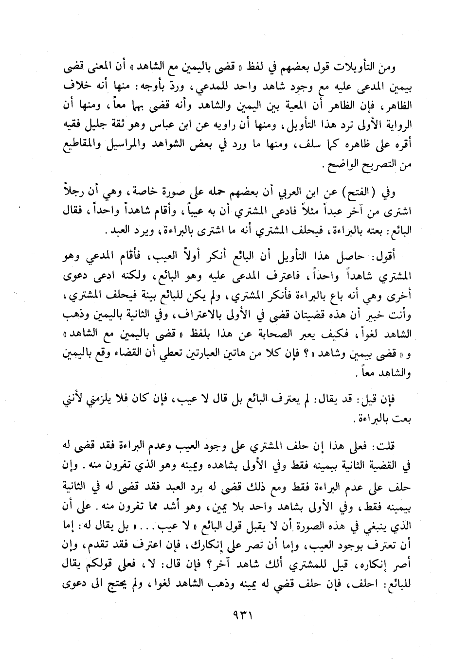 أقول: حاصل هذا التأويل أن البائع أنكر أولاً العيب، فأقام المدعي وهو المشتري شاهداً واحداً، فأعترف المدعي عليه وهو البائع، ولكنه أدعى دعوى أخرى وهي أنه باع بالبراءة فأنكر المشتري، ولم يكن للبائع بينة فيحلف المشتري. وأنت خبير أن هذه قضيتان قضي في الأولى بالاعتراف، وفي الثاني باليمين وذهب الشاهد لغواً فكيف يعبر الصحابة عن هذا بلفظ «قضى باليمين مع الشاهد» و «قضى بيمين وشاهد» ؟ فإن كلاً من هاتين العبارتين تعطي أن القضاء وقع باليمين والشاهد معاً.