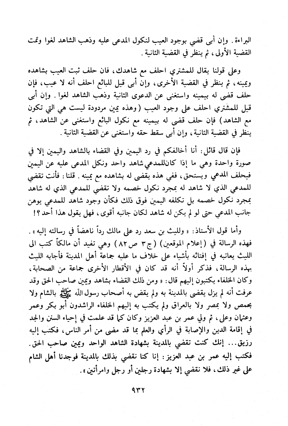 وأما قول الأستاذ: «والليث بن سعد رد على مالك رداً ناهضاً في رسالته إليه» . فهذه الرسالة في (إعلام الموقعين) ج 3 ص 82 وهي تفيد أن مالكاً كتب إلى الليث يعاتبه في إفتائه بأشياء على خلاف ما عليه جماعة أهل المدينة فأجابه الليث بهذه الرسالة، فذكر أولاً أنه قد كان في الأقطار الأخرى جماعة من الصحابة، وكان الخلفاء يكتبون إليهم قال: «ومن ذلك القضاء بشاهد ويمين صاحب الحق وقد عرفت أنه لم يزل يقضي بالمدينة به ولم يقض به لأصحاب رسول الله - صلى الله عليه وسلم -بالشام ولا بحمص ولا بمصر ولا بالعراق ولم يكتب به إليهم الخلفاء الراشدون أبو بكر وعمر وعثمان وعلي، ثم ولي عمر بن عبد العزيز وكان كما قد علمت في حإياء السنن والجد في إقامة الدين والإصابة في الرأي والعلم بما قد مضى من أمر الناس، فكتب إليه رزيق ... إنك كنت تقضي بالمدينة بشهادة الشاهد ويمين صاحب الحق، فكتب إليه عمر بن عبد العزيز: إنا كنا نقضي بذاك بالمدينة فوجدنا أهل الشام على غير ذلك، فلا نقضي إلا بشهادة رجلين أو رجل وامرأتين» .