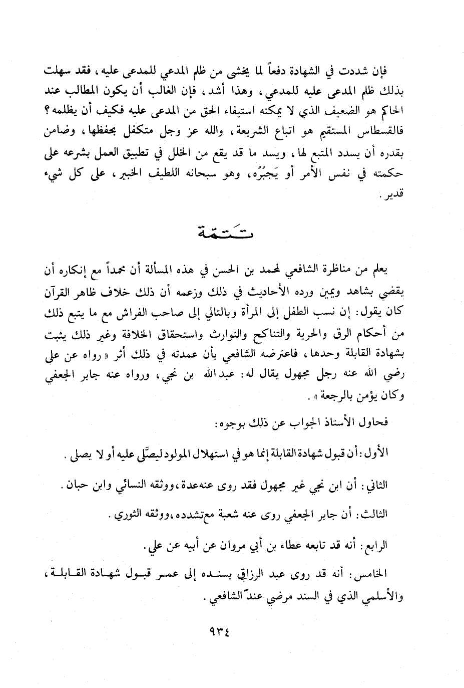 فإن شددت بالشهادة دفعاً لما يخشى من ظلم المدعي للمدعي عليه، فقد سهلت بذلك ظلم المدعى عليه للمدعي، وهذا أشد، فإن الغالب أن يكون المطالب عند الحاكم هو الضعيف اتلذي لا يمكنه استيفاء الحق من المدعى عليه فكيف أن يظلمه؟ فالقسطاس المستقيم هو إتباع الشريعة، والله عز وجل متكفل بحفظهما، وضامن بقدره أن يسدد المتبع لها، ويسد ما قد يقع من الخلل في تطبيق العمل بشرعه على حكمته في نفس الأمر أو يجبره. وهو سبحانه اللطيف الخبير، على كل شيء قدير.