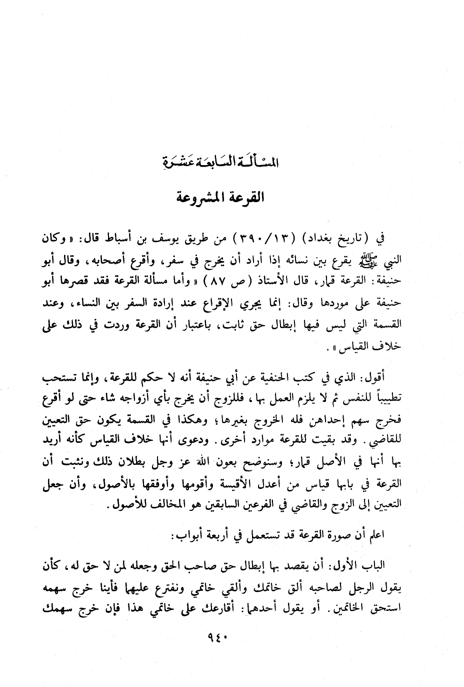 أقول: الذي في كتب الحنفية عن أبي حنيفة أنه لا حكم للقرعة، وإنما تستحب تطييباً للنفس ثم لا يلزم العمل بها، فللزوج أن يخرج بأي أزواجه شاء حتى لو أقرع فخرج سهم إحداهن فله الخروج بغيرها. وهكذا في القسمة يكون حق التعيين للقاضي. وقد بقين للقرعة موارد أخرى. ودعوى أنها خلاف القياس كأنه أريد بها في الأصل قمار. وسنوضح بعون الله عز وجل بطلان ذلك ونثبت أن القرعة في بابها قياس من أعدل الأقيسة وأقومها وأوفقها بالأصول، وأن جعل التعيين إلى الزوج والقاضي في الفرعين السابقين هو مخالف للأصول.