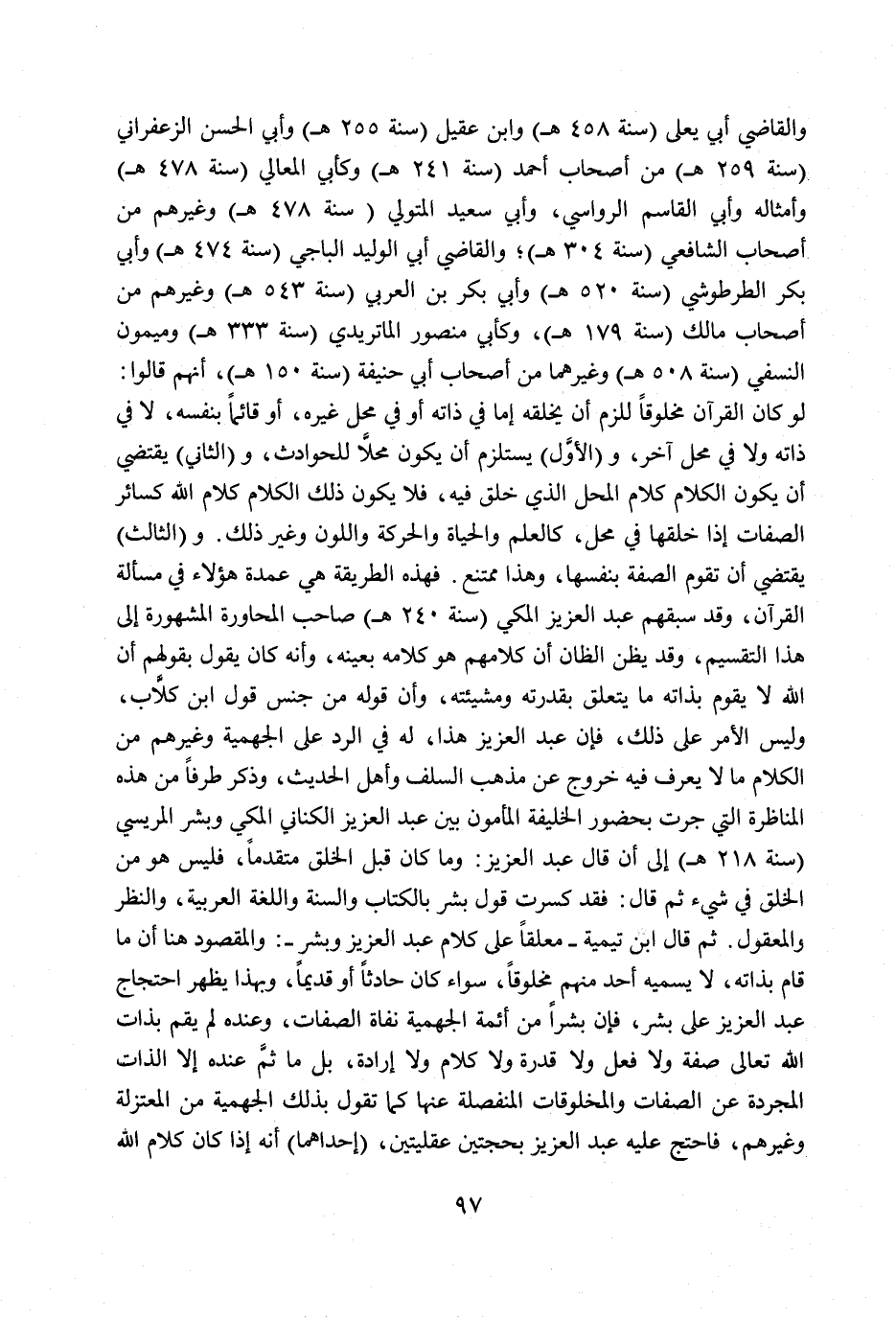 المناظرة التي جرت بحضور الخليفة المأمون بين عبد العزيز الكناني المكي وبشر المريسي (سنة 218 هـ) إلى أن قال عبد العزيز: وما كان قبل الخلق متقدماً، فليس هو من الخلق في شيء ثم قال: فقد كسرت قول بشر بالكتاب والسنة واللغة العربية، والنظر والمعقول. ثم قال ابن تيمية- معلقاً على كلام عبد العزيز وبشر-: والمقصود هنا أن ما قام بذاته، لا يسميه أحد منهم مخلوقاً، سواء كان حادثاً أو قديماً، وبهذا يظهر احتجاج عبد العزيز على بشر، فإن بشراً من أئمة الجهمية نفاة الصفات، وعنده لم يقم بذات الله تعالى صفة ولا فعل ولا قدرة ولا كلام ولا إرادة، بل ما ثمَّ عنده إلا الذات المجردة عن الصفات والمخلوقات المنفصلة عنها كما تقول بذلك الجهمية من المعتزلة وغيرهم، فاحتج عليه عبد العزيز بحجتين عقليتين، (إحداهما) أنه إذا كان كلام الله