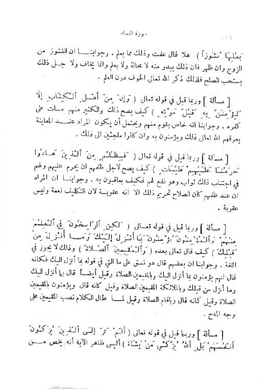 وربما قيل في قوله تعالى (لكِنِ الرَّاسِخُونَ فِي الْعِلْمِ مِنْهُمْ والْمُؤْمِنُونَ يُؤْمِنُونَ بِما أُنْزِلَ إِلَيْكَ وما أُنْزِلَ مِنْ قَبْلِكَ) كيف قال تعالى بعده (وَ الْمُقِيمِينَ الصَّلاةَ) وذلك لا يجوز في اللغة. وجوابنا ان بعضهم قال هو نسق على ما التي في قوله بما أنزل اليك فكانه قال انهم يؤمنون بما أنزل اليك وبالمقيمين الصلاة وقيل أيضا قال بما أنزل اليك وما أنزل من قبلك وبالملائكة المقيمين الصلاة وقيل كانه قال ويؤمنون بالمقيمين الصلاة وقيل كانه قال وباقام الصلاة وقيل لما طال الكلام نصب المقيمين على وجه المدح.