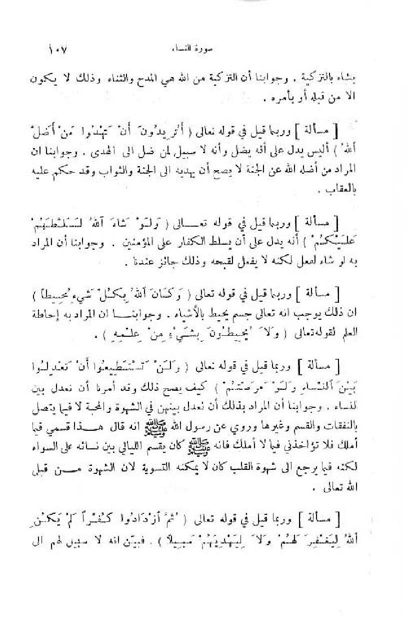 وربما قيل في قوله تعالى (وَ لَنْ تَسْتَطِيعُوا أَنْ تَعْدِلُوا بَيْنَ النِّساءِ ولَوْ حَرَصْتُمْ) كيف يصح ذلك وقد أمرنا أن نعدل بين النساء. وجوابنا أن المراد بذلك أن نعدل بينهن في الشهوة والمحبة لا فيما يتصل بالنفقات والقسم وغيرها وروي عن رسول اللّه صلّى اللّه عليه وسلم انه قال هذا قسمي فيما أملك فلا تؤاخذني فيما لا أملك فانه صلّى اللّه عليه وسلم كان يقسم الليالي بين نسائه على السواء لكنه فيما يرجع الى شهوة القلب كان لا يمكنه التسوية لان الشهوة من قبل اللّه تعالى.
