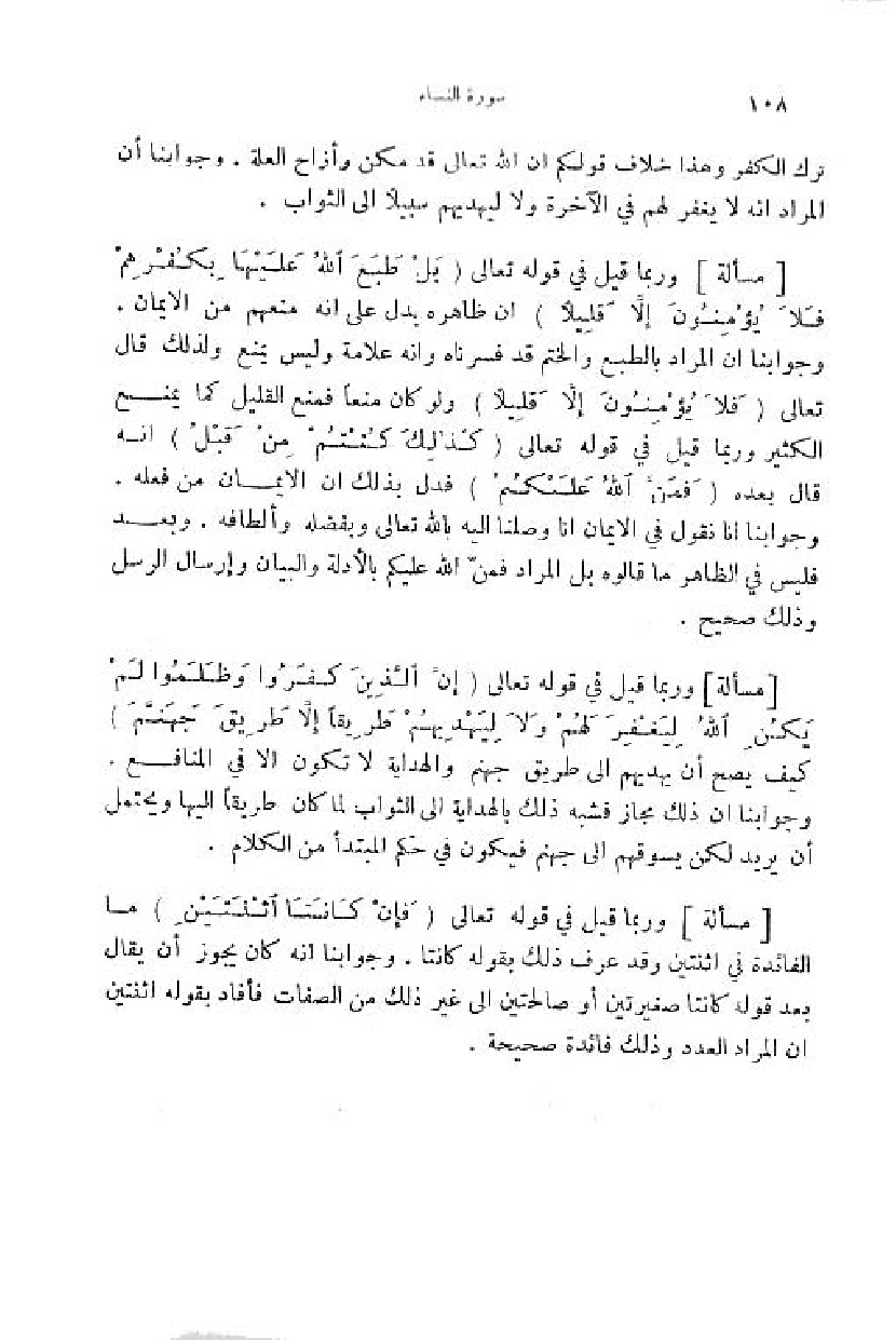 وجوابنا ان المراد بالطبع والختم قد فسرناه وانه علامة وليس يمنع ولذلك قال تعالى (فَلا يُؤْمِنُونَ إِلَّا قَلِيلًا) ولو كان منعا فمنع القليل كما يمنع الكثير وربما قيل في قوله تعالى (كَذلِكَ كُنْتُمْ مِنْ قَبْلُ) انه قال بعده (فَمَنَّ اللَّهُ عَلَيْكُمْ) فدل بذلك ان الايمان من فعله.