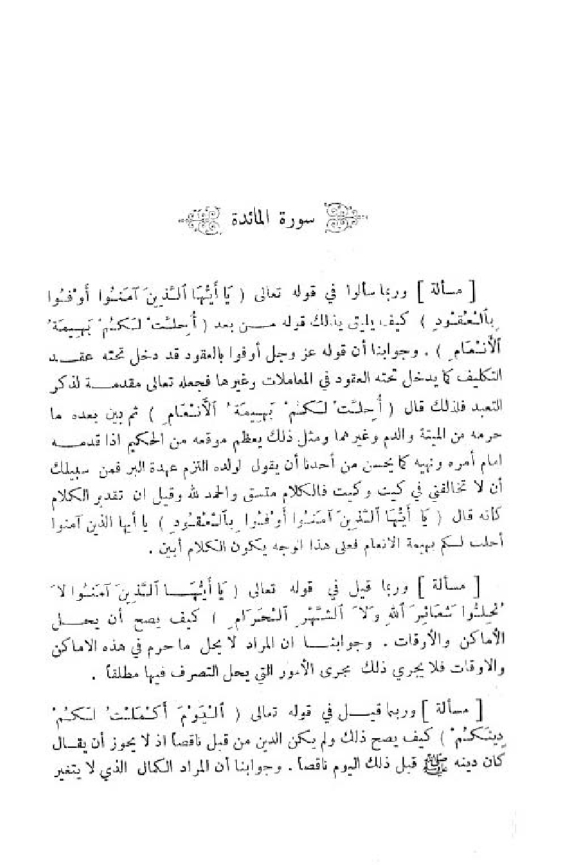 وربما سألوا في قوله تعالى (يا أَيُّهَا الَّذِينَ آمَنُوا أَوْفُوا بِالْعُقُودِ) كيف يليق بذلك قوله من بعد (أُحِلَّتْ لَكُمْ بَهِيمَةُ الْأَنْعامِ). وجوابنا أن قوله عز وجل أوفوا بالعقود قد دخل تحته عقد التكليف كما يدخل تحته العقود في المعاملات وغيرها فجعله تعالى مقدمة لذكر التعبد فلذلك قال (أُحِلَّتْ لَكُمْ بَهِيمَةُ الْأَنْعامِ) ثمّ بين بعده ما حرمه من الميتة والدم وغيرهما ومثل ذلك يعظم موقعه من الحكيم اذا قدمه امام أمره ونهيه كما يحسن من أحدنا أن يقول لولده التزم عهدة البر فمن سبيلك أن لا تخالفني في كيت وكيت فالكلام متسق والحمد للّه وقيل ان تقدير الكلام كأنه قال (يا أَيُّهَا الَّذِينَ آمَنُوا أَوْفُوا بِالْعُقُودِ) يا أيها الذين آمنوا أحلت لكم بهيمة الانعام فعلى هذا الوجه يكون الكلام أبين.