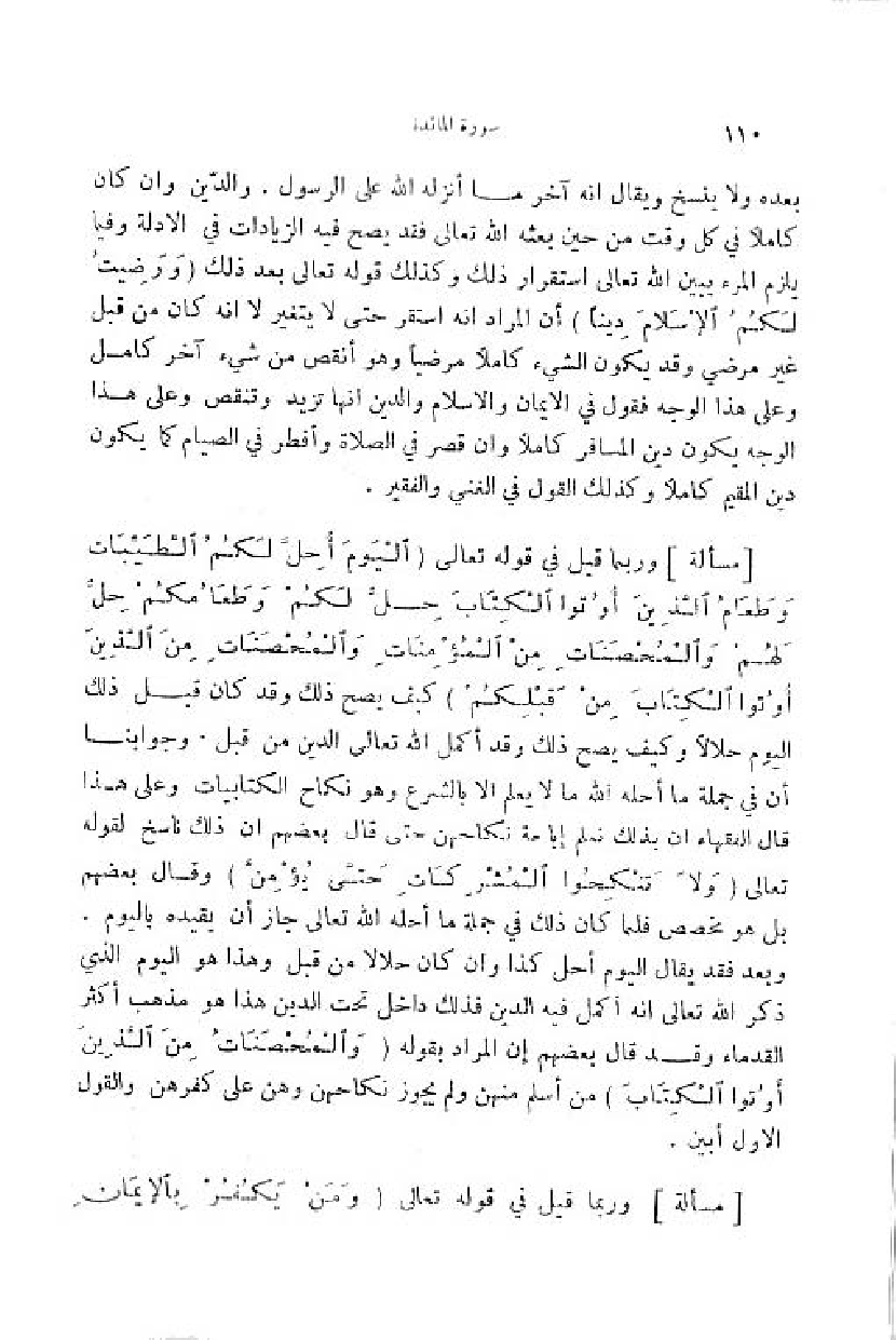 وربما قيل في قوله تعالى (الْيَوْمَ أُحِلَّ لَكُمُ الطَّيِّباتُ وطَعامُ الَّذِينَ أُوتُوا الْكِتابَ حِلٌّ لَكُمْ وطَعامُكُمْ حِلٌّ لَهُمْ والْمُحْصَناتُ مِنَ الْمُؤْمِناتِ والْمُحْصَناتُ مِنَ الَّذِينَ أُوتُوا الْكِتابَ مِنْ قَبْلِكُمْ) كيف يصح ذلك وقد كان قبل ذلك اليوم حلالا وكيف يصح ذلك وقد أكمل اللّه تعالى الدين من قبل. وجوابنا أن في جملة ما أحله اللّه ما لا يعلم الا بالشرع وهو نكاح الكتابيات وعلى هذا قال الفقهاء ان بذلك نعلم إباحة نكاحهن حتى قال بعضهم ان ذلك ناسخ لقوله تعالى (وَ لا تَنْكِحُوا الْمُشْرِكاتِ حَتَّى يُؤْمِنَّ) وقال بعضهم بل هو مخصص فلما كان ذلك في جملة ما أحله اللّه تعالى جاز أن يقيده باليوم.