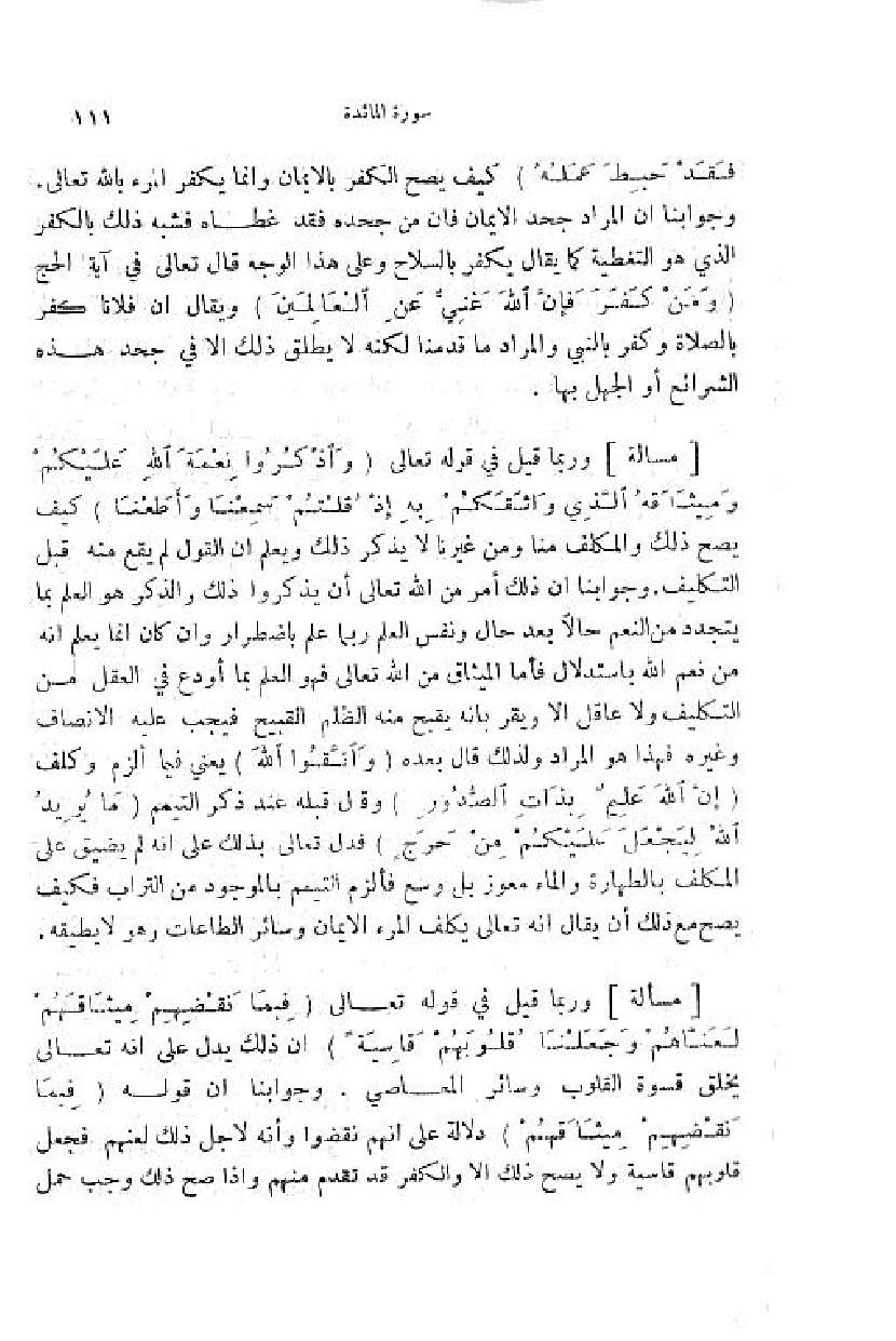 وربما قيل في قوله تعالى (وَ اذْكُرُوا نِعْمَةَ اللَّهِ عَلَيْكُمْ ومِيثاقَهُ الَّذِي واثَقَكُمْ بِهِ إِذْ قُلْتُمْ سَمِعْنا وأَطَعْنا) كيف يصح ذلك والمكلف منا ومن غيرنا لا يذكر ذلك ويعلم ان القول لم يقع منه قبل التكليف. وجوابنا ان ذلك أمر من اللّه تعالى أن يذكروا ذلك والذكر هو العلم بما يتجدد من النعم حالا بعد حال ونفس العلم ربما علم باضطرار وان كان انما يعلم انه من نعم اللّه باستدلال فأما الميثاق من اللّه تعالى فهو العلم بما أودع في العقل من التكليف ولا عاقل الا ويقر بانه يقبح منه الظلم القبيح فيجب عليه الانصاف وغيره فهذا هو المراد ولذلك قال بعده (وَ اتَّقُوا اللَّهَ) يعني فيما ألزم وكلف (إِنَّ اللَّهَ عَلِيمٌ بِذاتِ الصُّدُورِ) وقال قبله عند ذكر التيمم (ما يُرِيدُ اللَّهُ لِيَجْعَلَ عَلَيْكُمْ مِنْ حَرَجٍ) فدل تعالى بذلك على انه لم يضيق على المكلف بالطهارة والماء معوز بل وسع فألزم التيمم بالموجود من التراب فكيف يصح مع ذلك أن يقال انه تعالى يكلف المرء الايمان وسائر الطاعات وهو لا يطيقه.
