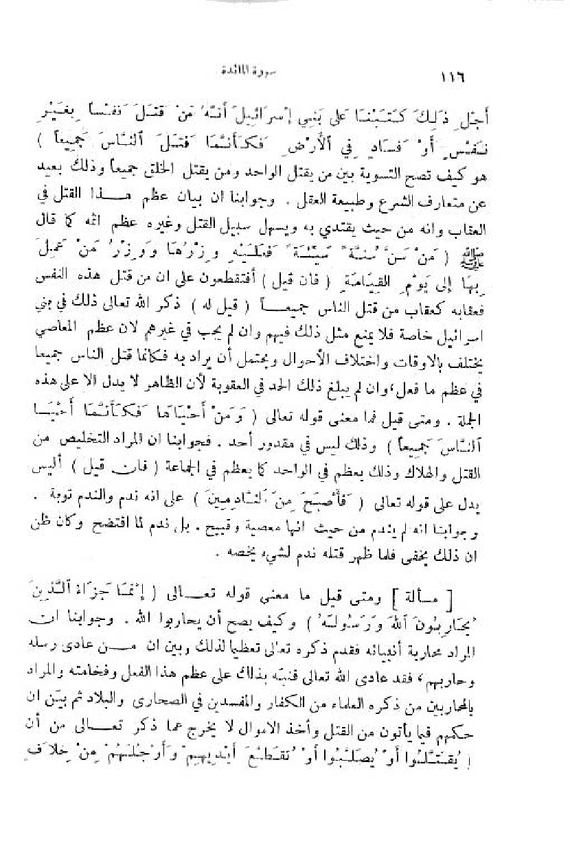(أَجْلِ ذلِكَ كَتَبْنا عَلى بَنِي إِسْرائِيلَ أَنَّهُ مَنْ قَتَلَ نَفْساً بِغَيْرِ نَفْسٍ أَوْ فَسادٍ فِي الْأَرْضِ فَكَأَنَّما قَتَلَ النَّاسَ جَمِيعاً) هو كيف تصح التسوية بين من يقتل الواحد ومن يقتل الخلق جميعا وذلك بعيد عن متعارف الشرع وطبيعة العقل. وجوابنا ان بيان عظم هذا القتل في العقاب وانه من حيث يقتدي به ويسهل سبيل القتل وغيره عظم اثمه كما قال صلّى اللّه عليه وسلم من سنّ سنّة سيّئة فعليه وزرها ووزر من عمل بها إلى يوم القيامة (فان قيل) أ فتقطعون على ان من قتل هذه النفس فعقابه كعقاب من قتل الناس جميعا (قيل له) ذكر اللّه تعالى ذلك في بني اسرائيل خاصة فلا يمنع مثل ذلك فيهم وان لم يجب في غيرهم لان عظم المعاصي يختلف بالاوقات واختلاف الأحوال ويحتمل أن يراد به فكأنما قتل الناس جميعا في عظم ما فعل، وان لم يبلغ ذلك الحد في العقوبة لأن الظاهر لا يدل الا على هذه الجملة. ومتى قيل فما معنى قوله تعالى (وَ مَنْ أَحْياها فَكَأَنَّما أَحْيَا النَّاسَ جَمِيعاً) وذلك ليس في مقدور أحد. فجوابنا ان المراد التخليص من القتل والهلاك وذلك يعظم في الواحد كما يعظم في الجماعة (فان قيل) أ ليس يدل على قوله تعالى (فَأَصْبَحَ مِنَ النَّادِمِينَ) على انه ندم والندم توبة.