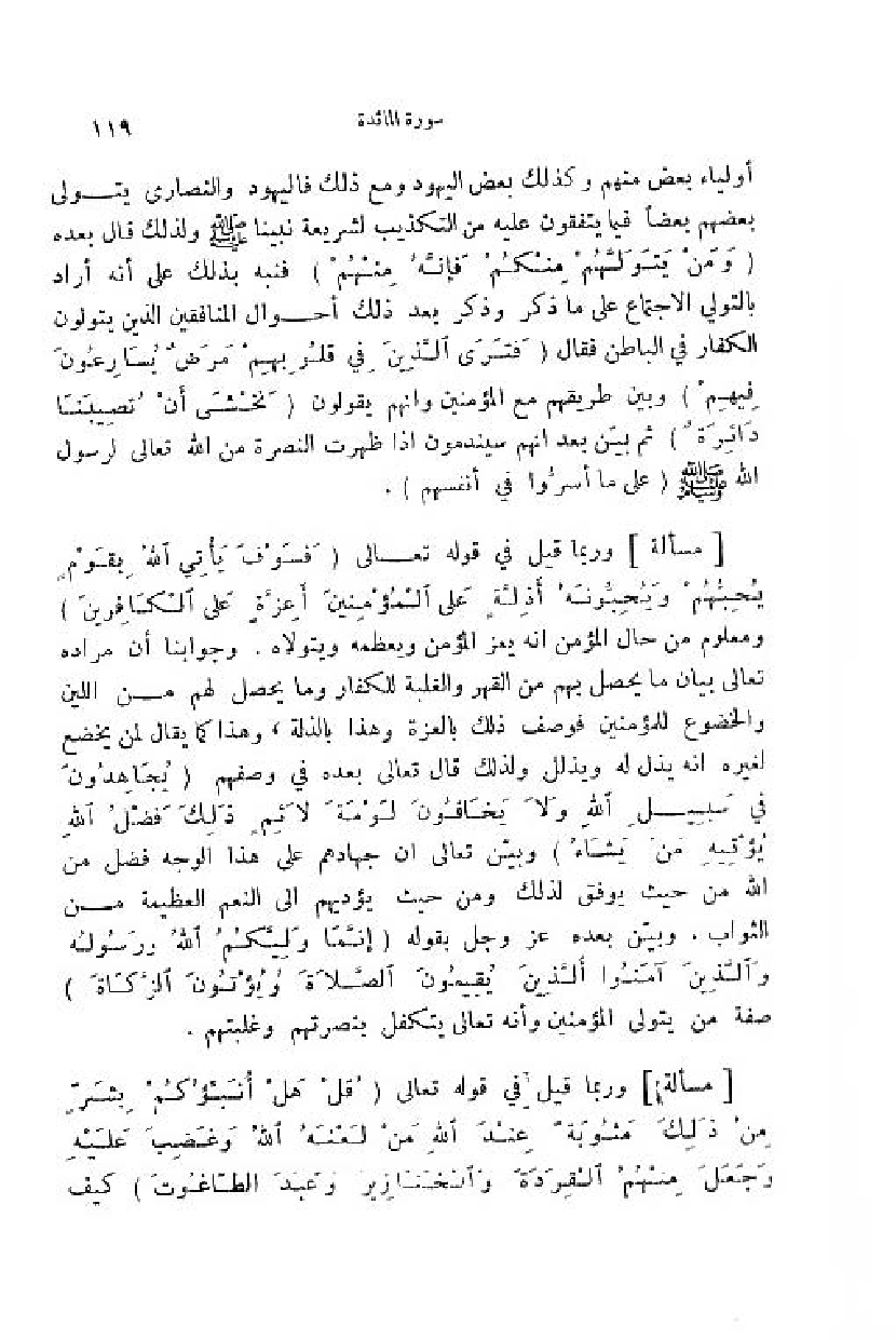 وربما قيل في قوله تعالى (فَسَوْفَ يَأْتِي اللَّهُ بِقَوْمٍ يُحِبُّهُمْ ويُحِبُّونَهُ أَذِلَّةٍ عَلَى الْمُؤْمِنِينَ أَعِزَّةٍ عَلَى الْكافِرِينَ) ومعلوم من حال المؤمن انه يعز المؤمن ويعظمه ويتولاه. وجوابنا أن مراده تعالى بيان ما يحصل بهم من القهر والغلبة للكفار وما يحصل لهم من اللين والخضوع للمؤمنين فوصف ذلك بالعزة وهذا بالذلة، وهذا كما يقال لمن يخضع لغيره انه يذل له ويذلل ولذلك قال تعالى بعده في وصفهم (يُجاهِدُونَ فِي سَبِيلِ اللَّهِ ولا يَخافُونَ لَوْمَةَ لائِمٍ ذلِكَ فَضْلُ اللَّهِ يُؤْتِيهِ مَنْ يَشاءُ) وبيّن تعالى ان جهادهم على هذا الوجه فضل من اللّه من حيث يوفق لذلك ومن حيث يؤديهم الى النعم العظيمة من الثواب. وبيّن بعده عز وجل بقوله (إِنَّما وَلِيُّكُمُ اللَّهُ ورَسُولُهُ والَّذِينَ آمَنُوا الَّذِينَ يُقِيمُونَ الصَّلاةَ ويُؤْتُونَ الزَّكاةَ) صفة من يتولى المؤمنين وأنه تعالى يتكفل بنصرتهم وغلبتهم.
