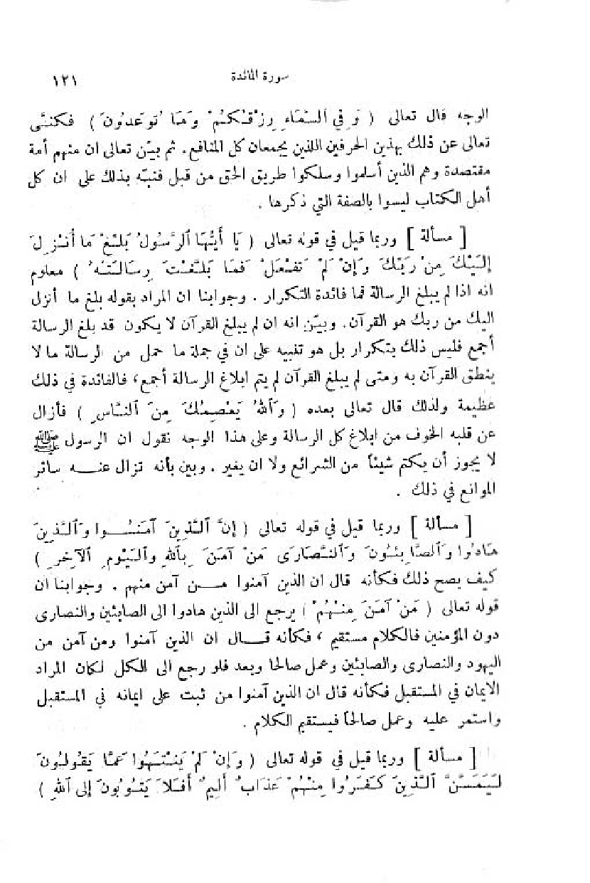 وربما قيل في قوله تعالى (إِنَّ الَّذِينَ آمَنُوا والَّذِينَ هادُوا والصَّابِئُونَ والنَّصارى مَنْ آمَنَ بِاللَّهِ والْيَوْمِ الْآخِرِ) كيف يصح ذلك فكأنه قال ان الذين آمنوا من آمن منهم. وجوابنا ان قوله تعالى (مَنْ آمَنَ مِنْهُمْ) يرجع الى الذين هادوا الى الصابئين والنصارى دون المؤمنين فالكلام مستقيم، فكأنه قال ان الذين آمنوا ومن آمن من اليهود والنصارى والصابئين وعمل صالحا وبعد فلو رجع الى الكل لكان المراد الايمان في المستقبل فكأنه قال ان الذين آمنوا من ثبت على ايمانه في المستقبل واستمر عليه وعمل صالحا فيستقيم الكلام.