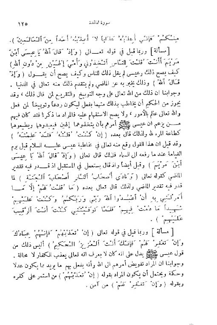 وربما قيل في قوله تعالى (إِنْ تُعَذِّبْهُمْ فَإِنَّهُمْ عِبادُكَ وإِنْ تَغْفِرْ لَهُمْ فَإِنَّكَ أَنْتَ الْعَزِيزُ الْحَكِيمُ) أ ليس ذلك من قول عيسى صلّى اللّه عليه وسلم يدل على انه كان لا يعرف انه تعالى يعذب الكفار لا محالة.