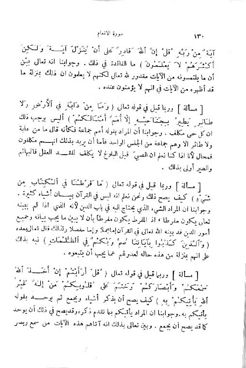 وربما قيل في قوله تعالى (وَ ما مِنْ دَابَّةٍ فِي الْأَرْضِ ولا طائِرٍ يَطِيرُ بِجَناحَيْهِ إِلَّا أُمَمٌ أَمْثالُكُمْ) أ ليس يوجب ذلك ان كل حي مكلف. وجوابنا أن المراد بقوله أمم جماعة فكأنه قال ما من دابة ولا طائر الا وهم جماعة من الجنس الواحد فأما أن يريد بذلك انهم مكلفون فمحال لأنا اذا كنا نعلم ان الصبيّ قبل البلوغ لا يكلف لفقد العقل فالبهائم والطير أولى بذلك.