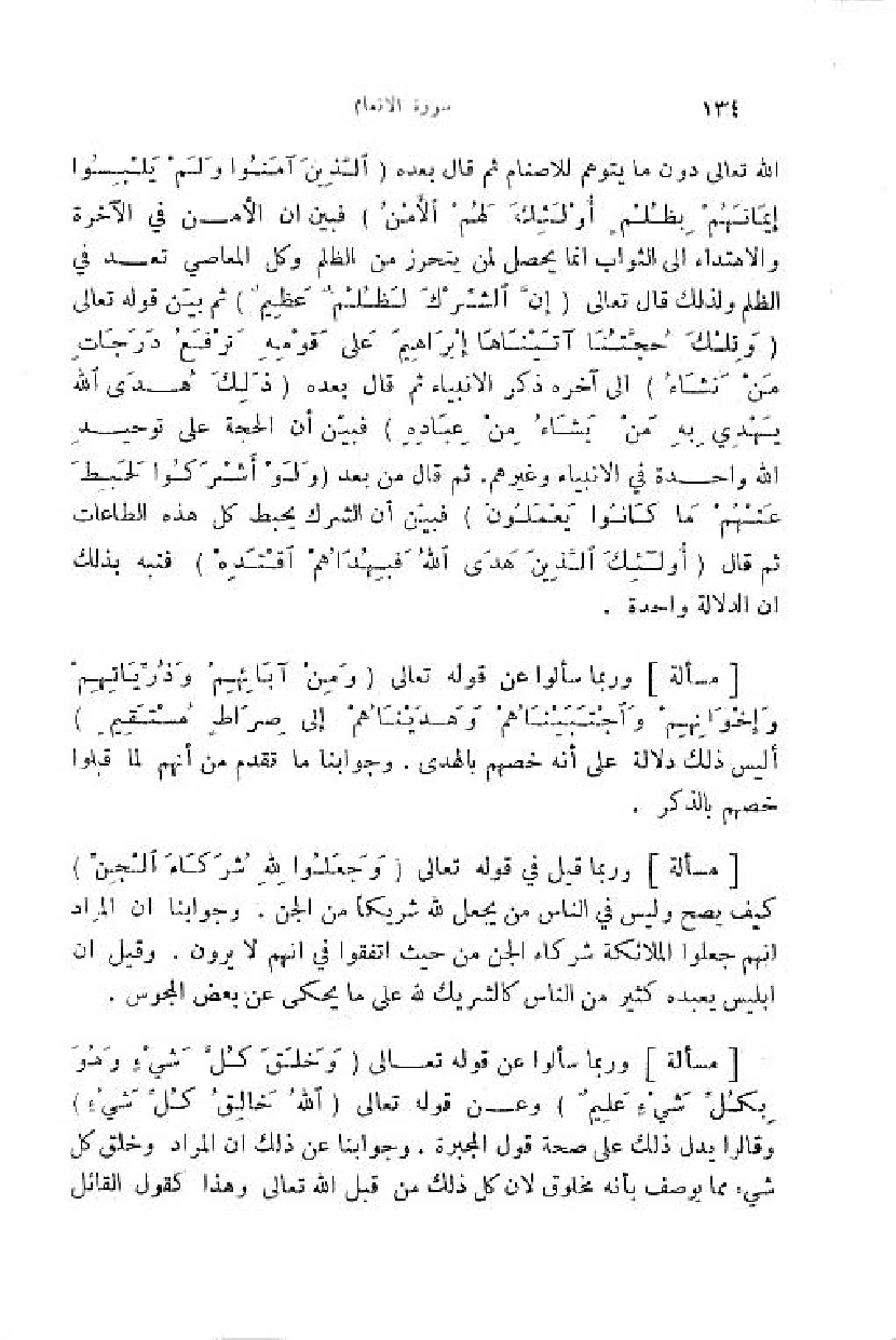 اللّه تعالى دون ما يتوهم للاصنام ثمّ قال بعده (الَّذِينَ آمَنُوا ولَمْ يَلْبِسُوا إِيمانَهُمْ بِظُلْمٍ أُولئِكَ لَهُمُ الْأَمْنُ) فبين ان الأمن في الآخرة والاهتداء الى الثواب انما يحصل لمن يتحرز من الظلم وكل المعاصي تعد في الظلم ولذلك قال تعالى (إِنَّ الشِّرْكَ لَظُلْمٌ عَظِيمٌ) ثمّ بيّن قوله تعالى (وَ تِلْكَ حُجَّتُنا آتَيْناها إِبْراهِيمَ عَلى قَوْمِهِ نَرْفَعُ دَرَجاتٍ مَنْ نَشاءُ) الى آخره ذكر الانبياء ثمّ قال بعده (ذلِكَ هُدَى اللَّهِ يَهْدِي بِهِ مَنْ يَشاءُ مِنْ عِبادِهِ) فبيّن أن الحجة على توحيد اللّه واحدة في الانبياء وغيرهم. ثمّ قال من بعد (وَ لَوْ أَشْرَكُوا لَحَبِطَ عَنْهُمْ ما كانُوا يَعْمَلُونَ) فبيّن أن الشرك يحبط كل هذه الطاعات ثمّ قال (أُولئِكَ الَّذِينَ هَدَى اللَّهُ فَبِهُداهُمُ اقْتَدِهْ) فنبه بذلك ان الدلالة واحدة.