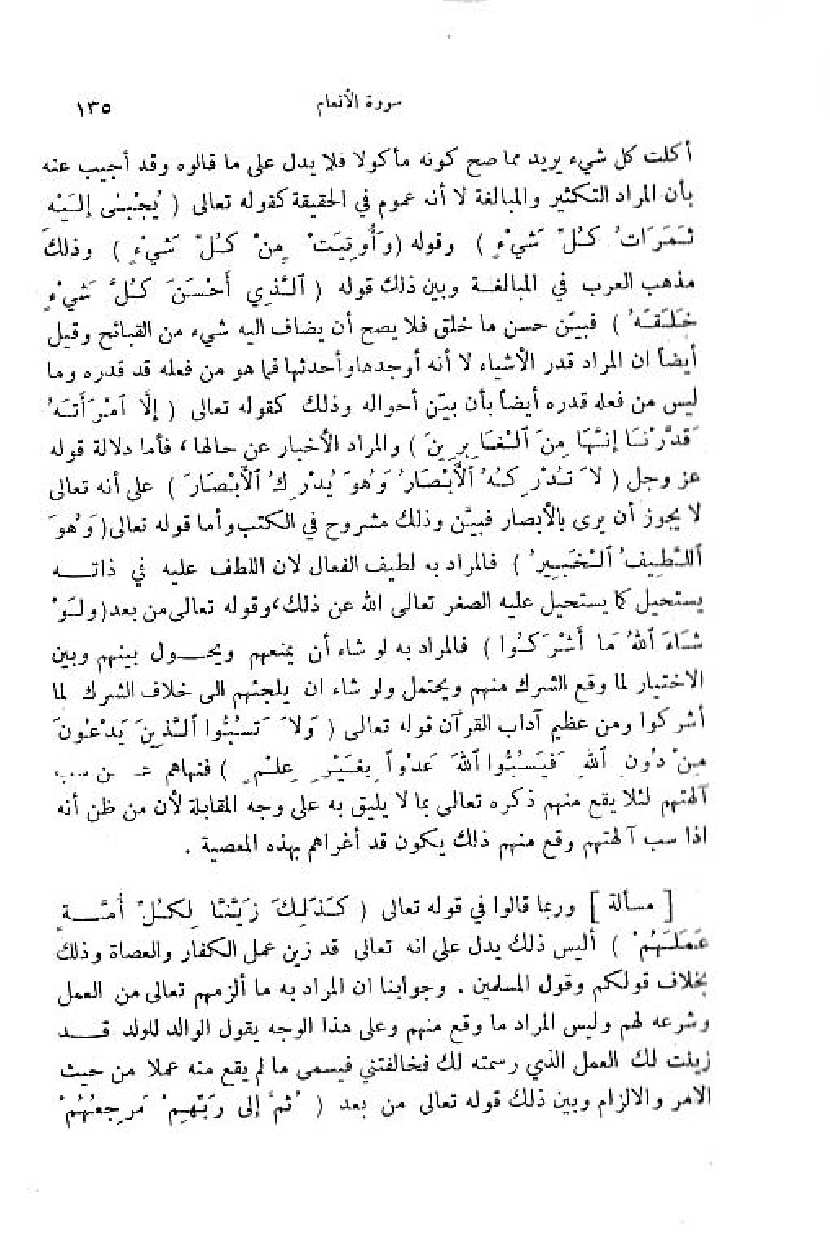 وربما قالوا في قوله تعالى (كَذلِكَ زَيَّنَّا لِكُلِّ أُمَّةٍ عَمَلَهُمْ) أ ليس ذلك يدل على انه تعالى قد زين عمل الكفار والعصاة وذلك بخلاف قولكم وقول المسلمين. وجوابنا ان المراد به ما ألزمهم تعالى من العمل وشرعه لهم وليس المراد ما وقع منهم وعلى هذا الوجه يقول الوالد للولد قد زينت لك العمل الذي رسمته لك فخالفتني فيسمى ما لم يقع منه عملا من حيث الامر والالزام وبين ذلك قوله تعالى من بعد (ثُمَّ إِلى رَبِّهِمْ مَرْجِعُهُمْ