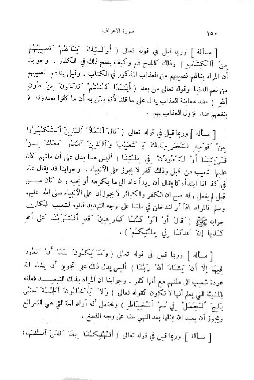 وربما قيل في قوله تعالى (وَ ما يَكُونُ لَنا أَنْ نَعُودَ فِيها إِلَّا أَنْ يَشاءَ اللَّهُ رَبُّنا) أ ليس يدل ذلك على تجويز أن يشاء اللّه عودة شعيب الى ملتهم مع أنها كفر. وجوابنا ان المراد بذلك التبعيد فعلقه بالمشيئة التي يعلم أنها لا تكون كقوله تعالى (وَ لا يَدْخُلُونَ الْجَنَّةَ حَتَّى يَلِجَ الْجَمَلُ فِي سَمِّ الْخِياطِ) ويحتمل أنه أراد الملة التي هي الشرائع ويجوز أن يعبد اللّه بمثلها بعد النهي عنه على وجه النسخ.