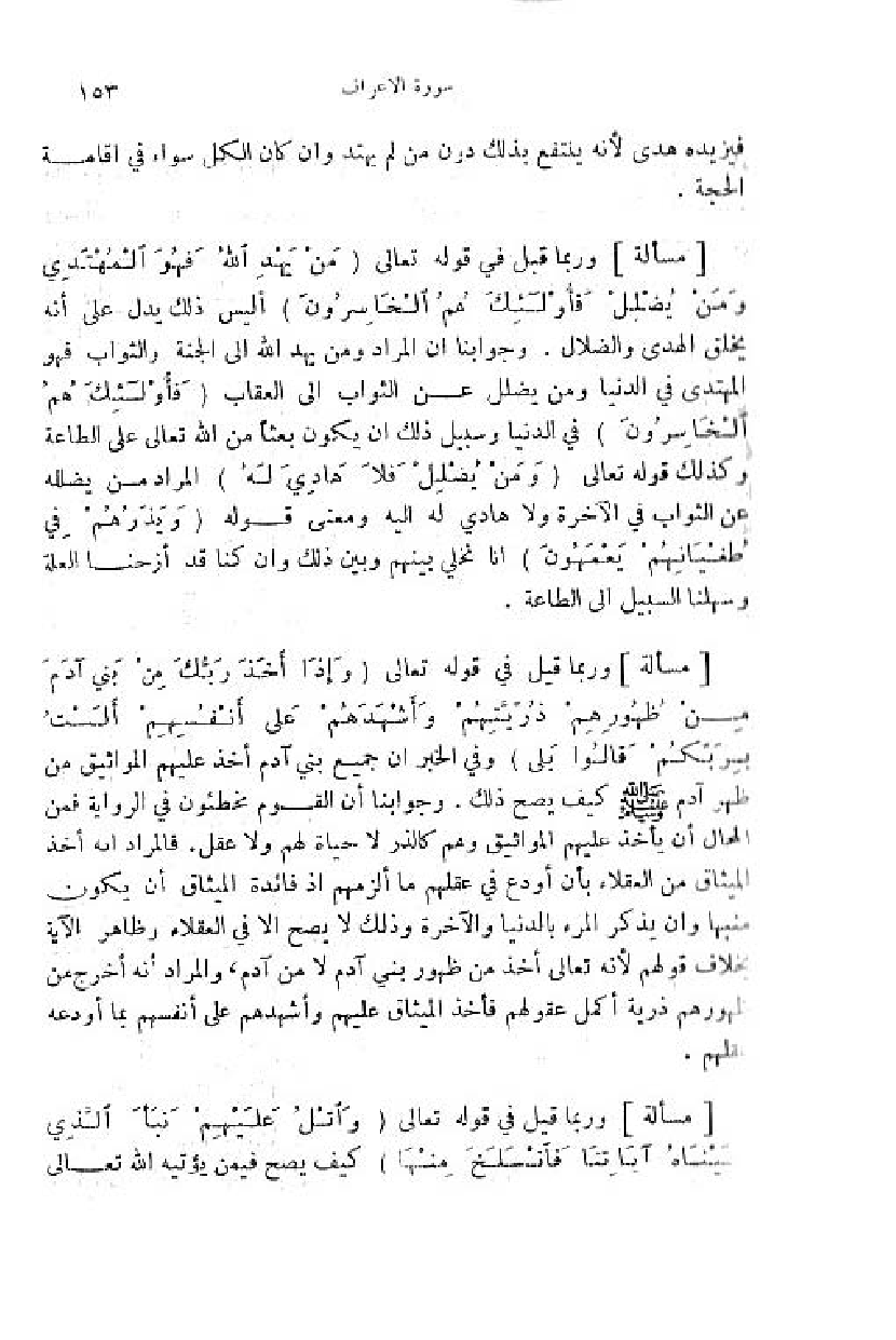 وربما قيل في قوله تعالى (وَ إِذْ أَخَذَ رَبُّكَ مِنْ بَنِي آدَمَ مِنْ ظُهُورِهِمْ ذُرِّيَّتَهُمْ وأَشْهَدَهُمْ عَلى أَنْفُسِهِمْ أَ لَسْتُ بِرَبِّكُمْ قالُوا بَلى) وفي الخبر ان جميع بني آدم أخذ عليهم المواثيق من ظهر آدم صلّى اللّه عليه وسلم كيف يصح ذلك. وجوابنا أن القوم مخطئون في الرواية فمن المحال أن يأخذ عليهم المواثيق وهم كالذر لا حياة لهم ولا عقل. فالمراد انه أخذ الميثاق من العقلاء بأن أودع في عقلهم ما ألزمهم اذ فائدة الميثاق أن يكون منبها وان يذكر المرء بالدنيا والآخرة وذلك لا يصح الا في العقلاء وظاهر الآية بخلاف قولهم لأنه تعالى أخذ من ظهور بني آدم لا من آدم، والمراد أنه أخرج من ظهورهم ذرية أكمل عقولهم فأخذ الميثاق عليهم وأشهدهم على أنفسهم بما أودعه عقلهم.