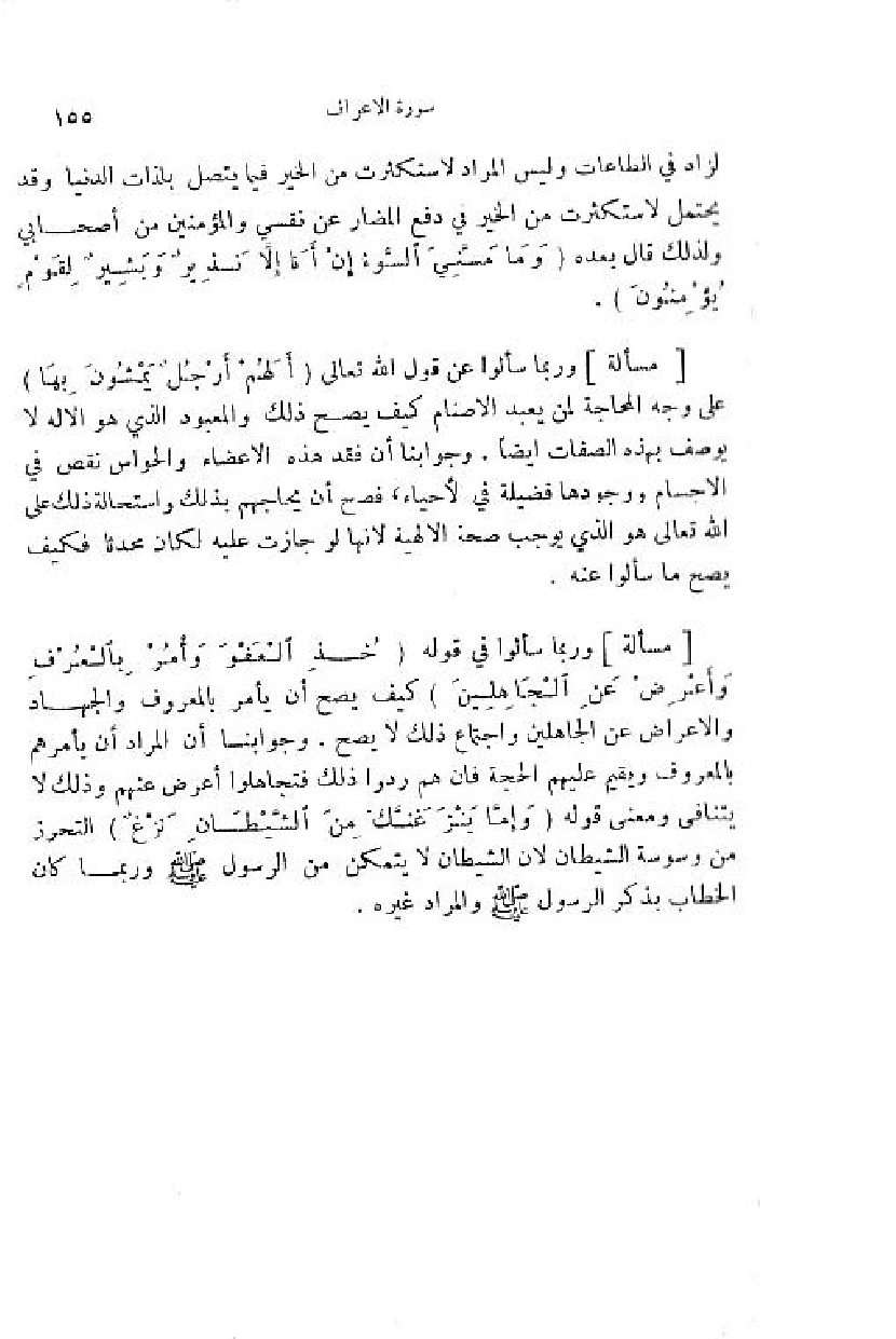 وربما سألوا عن قول اللّه تعالى (أَ لَهُمْ أَرْجُلٌ يَمْشُونَ بِها) على وجه المحاجة لمن يعبد الاصنام كيف يصح ذلك والمعبود الذي هو الاله لا يوصف بهذه الصفات أيضا. وجوابنا أن فقد هذه الاعضاء والحواس نقص في الاجسام ووجودها فضيلة في الأحياء، فصح أن يحاجهم بذلك واستحالة ذلك على اللّه تعالى هو الذي يوجب صحة الالهية لانها لو جازت عليه لكان محدثا فكيف يصح ما سألوا عنه.