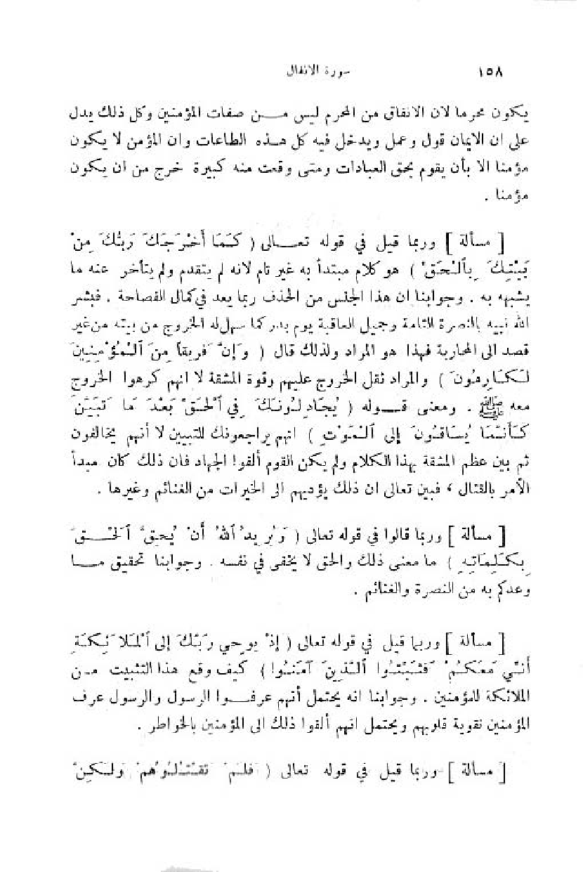 وربما قيل في قوله تعالى (كَما أَخْرَجَكَ رَبُّكَ مِنْ بَيْتِكَ بِالْحَقِّ) هو كلام مبتدأ به غير تام لانه لم يتقدم ولم يتأخر عنه ما يشبهه به. وجوابنا ان هذا الجنس من الحذف ربما يعد في كمال الفصاحة. فبشر اللّه نبيه بالنصرة التامة وجميل العاقبة يوم بدر كما سهل له الخروج من بيته من غير قصد الى المحاربة فهذا هو المراد ولذلك قال (وَ إِنَّ فَرِيقاً مِنَ الْمُؤْمِنِينَ لَكارِهُونَ) والمراد ثقل الخروج عليهم وقوة المشقة لا انهم كرهوا الخروج معه صلّى اللّه عليه وسلم. ومعنى قوله (يُجادِلُونَكَ فِي الْحَقِّ بَعْدَ ما تَبَيَّنَ كَأَنَّما يُساقُونَ إِلَى الْمَوْتِ) انهم يراجعونك للتبيين لا أنهم يخالفون ثمّ بين عظم المشقة بهذا الكلام ولم يكن القوم ألفوا الجهاد فان ذلك كان مبدأ الأمر بالقتال، فبين تعالى ان ذلك يؤديهم الى الخيرات من الغنائم وغيرها.