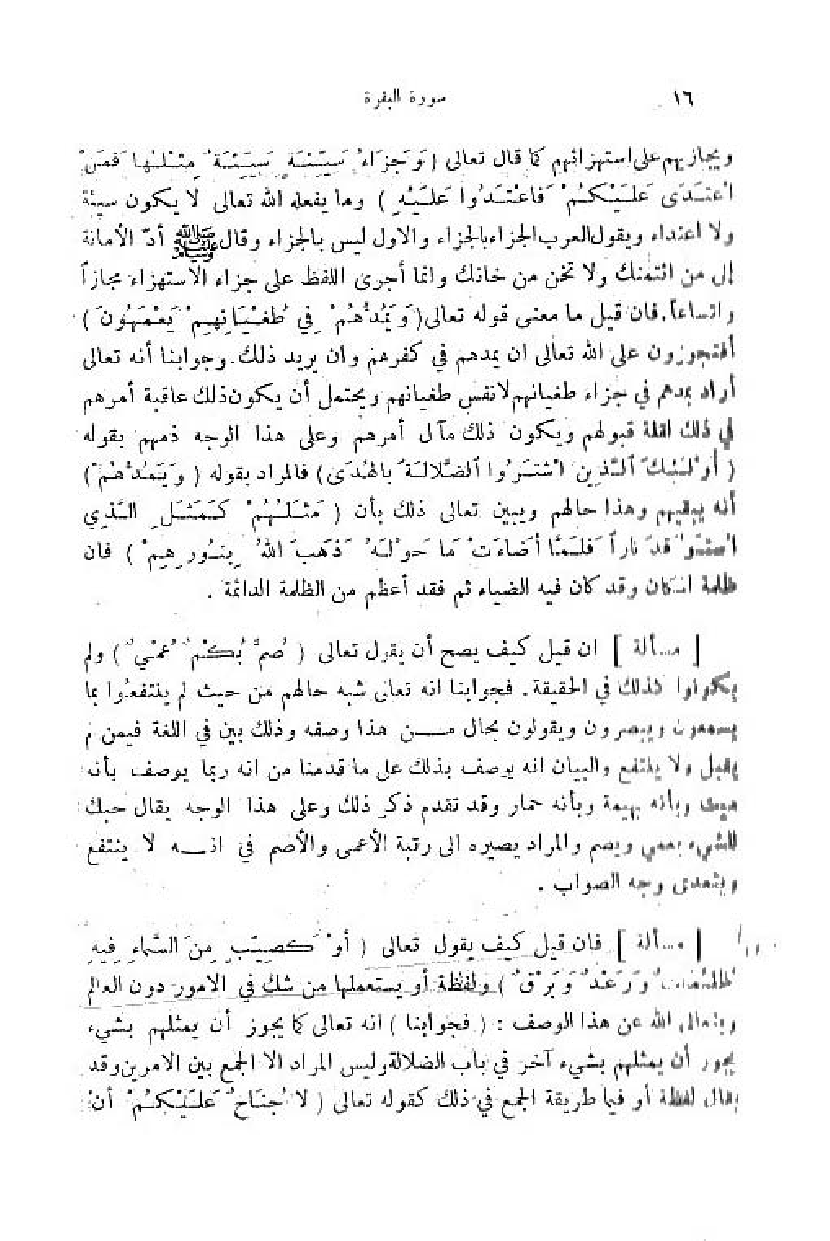 فان قيل كيف يقول تعالى (أَوْ كَصَيِّبٍ مِنَ السَّماءِ فِيهِ ظُلُماتٌ ورَعْدٌ وبَرْقٌ) ولفظة أو يستعملها من شك في الامور دون العالم ويتعالى اللّه عن هذا الوصف: (فجوابنا) انه تعالى كما يجوز أن يمثلهم بشيء يجوز أن يمثلهم بشيء آخر في باب الضلالة وليس المراد الا الجمع بين الامرين وقد يقال لفظة أو فيما طريقة الجمع في ذلك كقوله تعالى (لا جُناحَ عَلَيْكُمْ إِنْ)