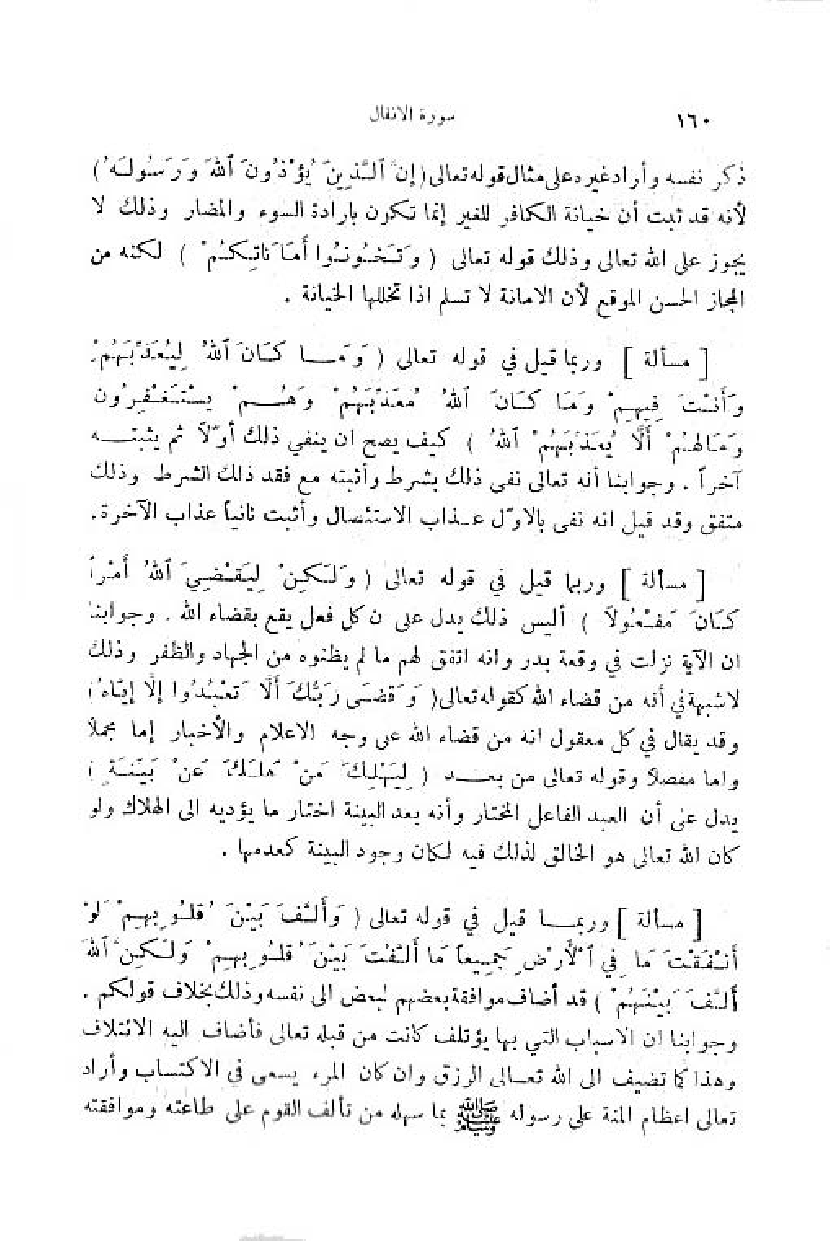 وربما قيل في قوله تعالى (وَ ما كانَ اللَّهُ لِيُعَذِّبَهُمْ وأَنْتَ فِيهِمْ وما كانَ اللَّهُ مُعَذِّبَهُمْ وهُمْ يَسْتَغْفِرُونَ وما لَهُمْ أَلَّا يُعَذِّبَهُمُ اللَّهُ) كيف يصح ان ينفي ذلك أوّلا ثمّ يثبته آخرا. وجوابنا أنه تعالى نفى ذلك بشرط وأثبته مع فقد ذلك الشرط وذلك متفق وقد قيل انه نفى بالاوّل عذاب الاستئصال وأثبت ثانيا عذاب الآخرة.