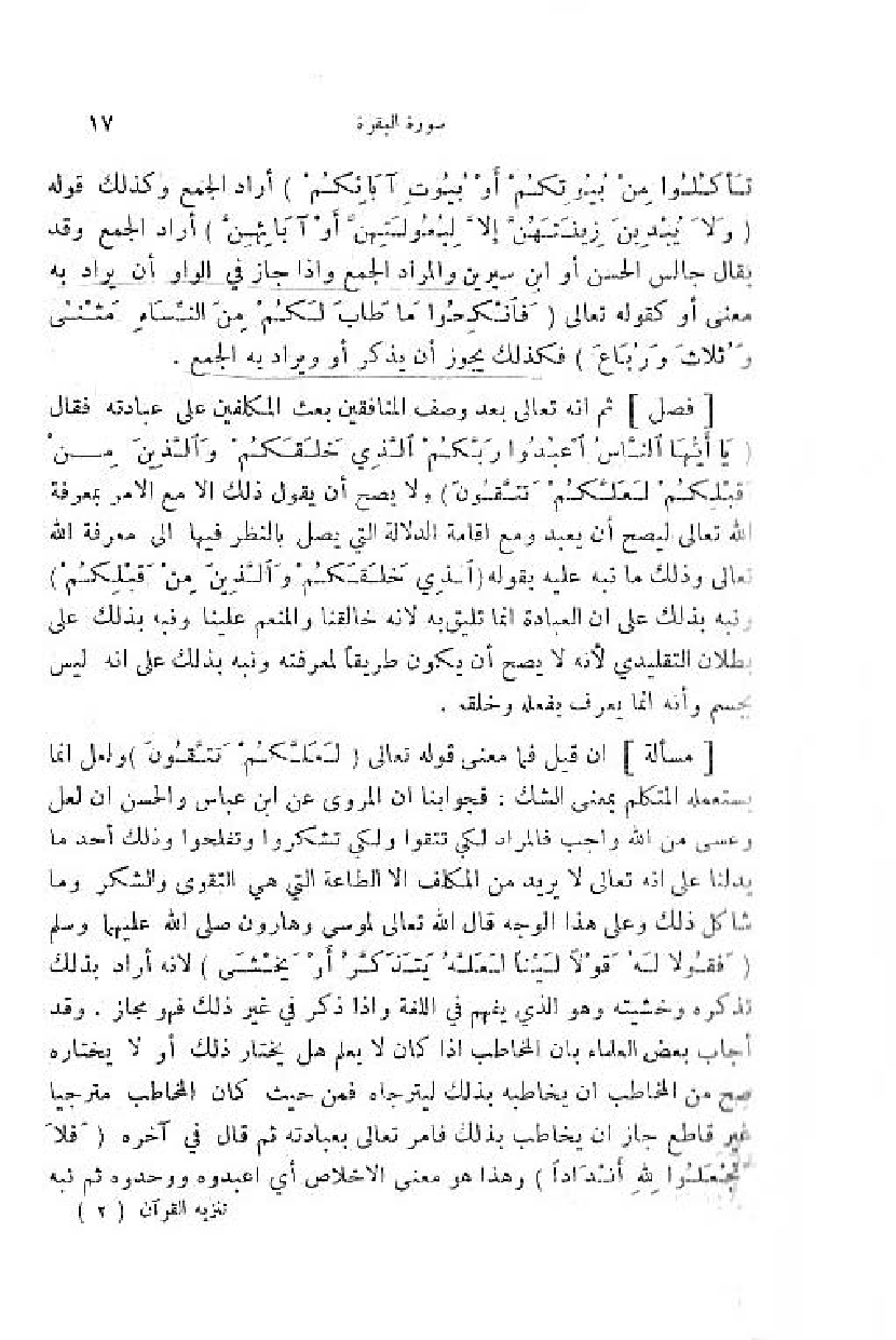 ان قيل فما معنى قوله تعالى (لَعَلَّكُمْ تَتَّقُونَ) ولعل انما يستعمله المتكلم بمعنى الشك: فجوابنا ان المروى عن ابن عباس والحسن ان لعل وعسى من اللّه واجب فالمراد لكي تتقوا ولكي تشكروا وتفلحوا وذلك أحد ما يدلنا على انه تعالى لا يريد من المكلف الا الطاعة التي هي التقوى والشكر وما شاكل ذلك وعلى هذا الوجه قال اللّه تعالى لموسى وهارون صلّى اللّه عليهما وسلم (فَقُولا لَهُ قَوْلًا لَيِّناً لَعَلَّهُ يَتَذَكَّرُ أَوْ يَخْشى) لانه أراد بذلك تذكره وخشيته وهو الذي يفهم في اللغة واذا ذكر في غير ذلك فهو مجاز. وقد أجاب بعض العلماء بان المخاطب اذا كان لا يعلم هل يختار ذلك أو لا يختاره صح من المخاطب ان يخاطبه بذلك ليترجاه فمن حيث كان المخاطب مترجيا غير قاطع جاز ان يخاطب بذلك فامر تعالى بعبادته ثمّ قال في آخره (فَلا تَجْعَلُوا لِلَّهِ أَنْداداً) وهذا هو معنى الاخلاص أي اعبدوه ووحدوه ثمّ نبه تنزيه القرآن (2)