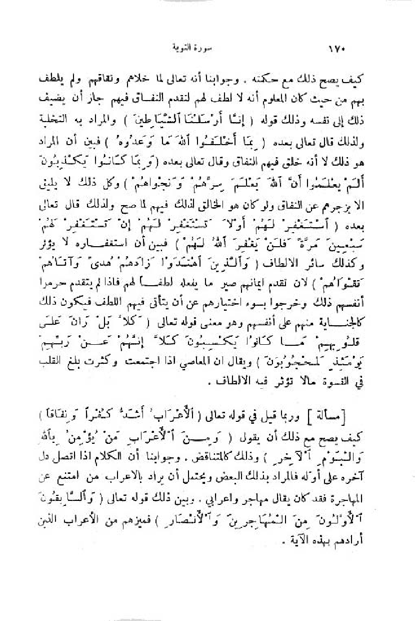 وربما قيل في قوله تعالى (الْأَعْرابُ أَشَدُّ كُفْراً ونِفاقاً) كيف يصح مع ذلك أن يقول (وَ مِنَ الْأَعْرابِ مَنْ يُؤْمِنُ بِاللَّهِ والْيَوْمِ الْآخِرِ) وذلك كالمتناقض. وجوابنا أن الكلام اذا اتصل دل آخره على أوّله فالمراد بذلك البعض ويحتمل أن يراد بالاعراب من امتنع عن المهاجرة فقد كان يقال مهاجر واعرابي. وبين ذلك قوله تعالى (وَ السَّابِقُونَ الْأَوَّلُونَ مِنَ الْمُهاجِرِينَ والْأَنْصارِ) فميزهم من الأعراب الذين أرادهم بهذه الآية.