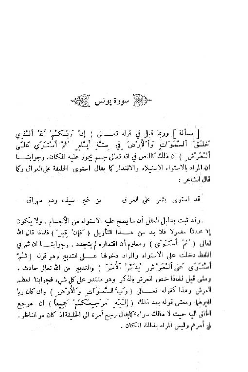 وربما قيل في قوله تعالى (إِنَّ رَبَّكُمُ اللَّهُ الَّذِي خَلَقَ السَّماواتِ والْأَرْضَ فِي سِتَّةِ أَيَّامٍ ثُمَّ اسْتَوى عَلَى الْعَرْشِ) ان ذلك كالنص في انه تعالى جسم يجوز عليه المكان. وجوابنا ان المراد بالاستواء الاستيلاء والاقتدار كما يقال استوى الخليفة على العراق وكما قال الشاعر: