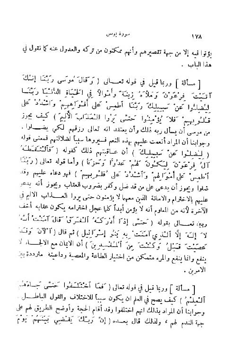 وجوابنا أن المراد أنعمت عليهم بهذه النعم فسيروها سببا لضلالتهم فمعنى قوله (لِيُضِلُّوا عَنْ سَبِيلِكَ) أن عاقبتهم ذلك كقوله (فَالْتَقَطَهُ آلُ فِرْعَوْنَ لِيَكُونَ لَهُمْ عَدُوًّا وحَزَناً) وأما قوله تعالى (رَبَّنَا اطْمِسْ عَلى أَمْوالِهِمْ واشْدُدْ عَلى قُلُوبِهِمْ) فهو دعاء عليهم وقد ضلوا ويجوز أن يدعى على من قد ضل وكفر بضروب العقاب ويجوز أنه يدعو عليهم بالاخترام والاماتة الذين معهما لا يؤمنون حتى يروا العذاب الاليم في الآخرة لأنه من المعلوم أنه لا يؤمن أبدا كلما عجل اخترامه يكون عقابه أخف وبين تعالى بقوله (حَتَّى إِذا أَدْرَكَهُ الْغَرَقُ قالَ آمَنْتُ أَنَّهُ لا إِلهَ إِلَّا الَّذِي آمَنَتْ بِهِ بَنُوا إِسْرائِيلَ) ثمّ قال (آلْآنَ وقَدْ عَصَيْتَ قَبْلُ وكُنْتَ مِنَ الْمُفْسِدِينَ) أن الايمان مع الالجاء لا ينفع وانما ينفع والمرء متمكن من اختيار الطاعة والمعصية وداعيته مترددة بين الامرين.