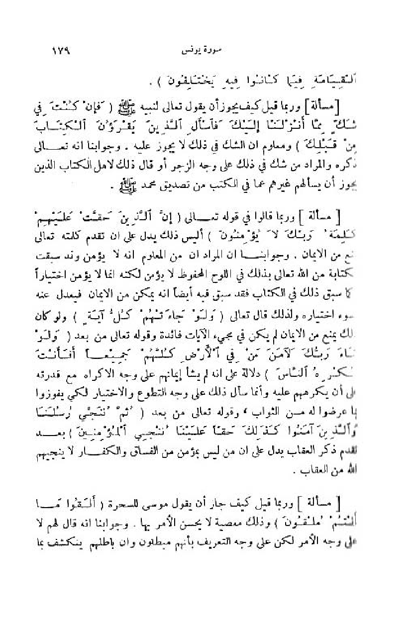 وربما قالوا في قوله تعالى (إِنَّ الَّذِينَ حَقَّتْ عَلَيْهِمْ كَلِمَتُ رَبِّكَ لا يُؤْمِنُونَ) أ ليس ذلك يدل على ان تقدم كلمته تعالى يمنع من الايمان. وجوابنا ان المراد ان من المعلوم انه لا يؤمن وقد سبقت الكتابة من اللّه تعالى بذلك في اللوح المحفوظ لا يؤمن لكنه انما لا يؤمن اختيارا وكما سبق ذلك في الكتاب فقد سبق فيه أيضا انه يمكن من الايمان فيعدل عنه بسوء اختياره ولذلك قال تعالى (وَ لَوْ جاءَتْهُمْ كُلُّ آيَةٍ) ولو كان ذلك يمنع من الايمان لم يكن في مجيء الآيات فائدة وقوله تعالى من بعد (وَ لَوْ شاءَ رَبُّكَ لَآمَنَ مَنْ فِي الْأَرْضِ كُلُّهُمْ جَمِيعاً أَ فَأَنْتَ تُكْرِهُ النَّاسَ) دلالة على انه لم يشأ إيمانهم على وجه الاكراه مع قدرته على أن يكرههم عليه وأنما سأل ذلك على وجه التطوع والاختيار لكي يفوزوا بما عرضوا له من الثواب، وقوله تعالى من بعد (ثُمَّ نُنَجِّي رُسُلَنا والَّذِينَ آمَنُوا كَذلِكَ حَقًّا عَلَيْنا نُنْجِ الْمُؤْمِنِينَ) بعد تقدم ذكر العقاب يدل على ان من ليس بمؤمن من الفساق والكفار لا ينجيهم اللّه من العقاب.