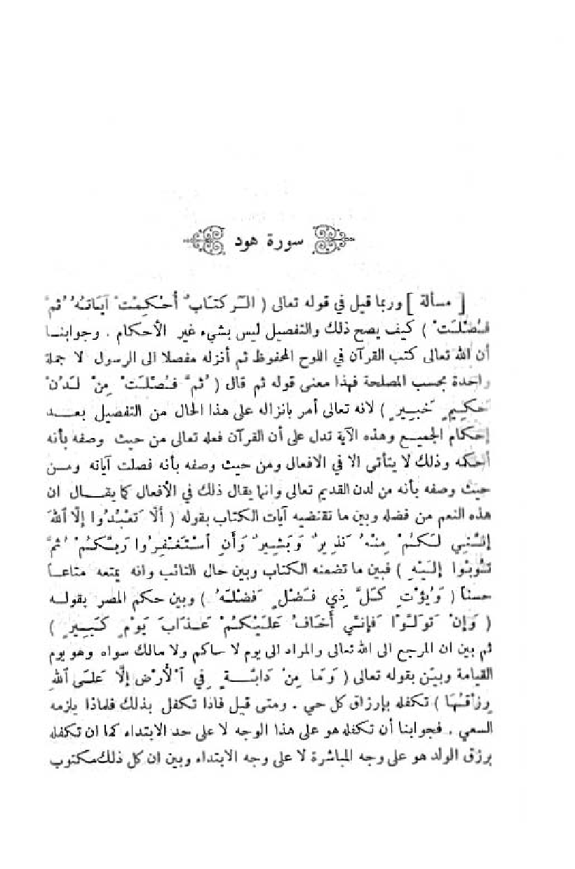 وربما قيل في قوله تعالى (الر كِتابٌ أُحْكِمَتْ آياتُهُ ثُمَّ فُصِّلَتْ) كيف يصح ذلك والتفصيل ليس بشيء غير الأحكام. وجوابنا أن اللّه تعالى كتب القرآن في اللوح المحفوظ ثمّ أنزله مفصلا الى الرسول لا جملة واحدة بحسب المصلحة فهذا معنى قوله ثمّ قال (ثُمَّ فُصِّلَتْ مِنْ لَدُنْ حَكِيمٍ خَبِيرٍ) لانه تعالى أمر بانزاله على هذا الحال من التفصيل بعد إحكام الجميع وهذه الآية تدل على أن القرآن فعله تعالى من حيث وصفه بأنه أحكمه وذلك لا يتأتى الا في الافعال ومن حيث وصفه بأنه فصلت آياته ومن حيث وصفه بأنه من لدن القديم تعالى وانما يقال ذلك في الأفعال كما يقال ان هذه النعم من فضله وبين ما تقتضيه آيات الكتاب بقوله (أَلَّا تَعْبُدُوا إِلَّا اللَّهَ إِنَّنِي لَكُمْ مِنْهُ نَذِيرٌ وبَشِيرٌ وأَنِ اسْتَغْفِرُوا رَبَّكُمْ ثُمَّ تُوبُوا إِلَيْهِ) فبين ما تضمنه الكتاب وبين حال التائب وانه يمتعه متاعا حسنا (وَ يُؤْتِ كُلَّ ذِي فَضْلٍ فَضْلَهُ) وبين حكم المصر بقوله (وَ إِنْ تَوَلَّوْا فَإِنِّي أَخافُ عَلَيْكُمْ عَذابَ يَوْمٍ كَبِيرٍ) ثمّ بين ان المرجع الى اللّه تعالى والمراد الى يوم لا حاكم ولا مالك سواه وهو يوم القيامة وبيّن بقوله تعالى (وَ ما مِنْ دَابَّةٍ فِي الْأَرْضِ إِلَّا عَلَى اللَّهِ رِزْقُها) تكفله بإرزاق كل حي. ومتى قيل فاذا تكفل بذلك فلما ذا يلزمه السعي. فجوابنا أن تكفله هو على هذا الوجه لا على حد الابتداء كما ان تكفله برزق الولد هو على وجه المباشرة لا على وجه الابتداء وبين ان كل ذلك مكتوب