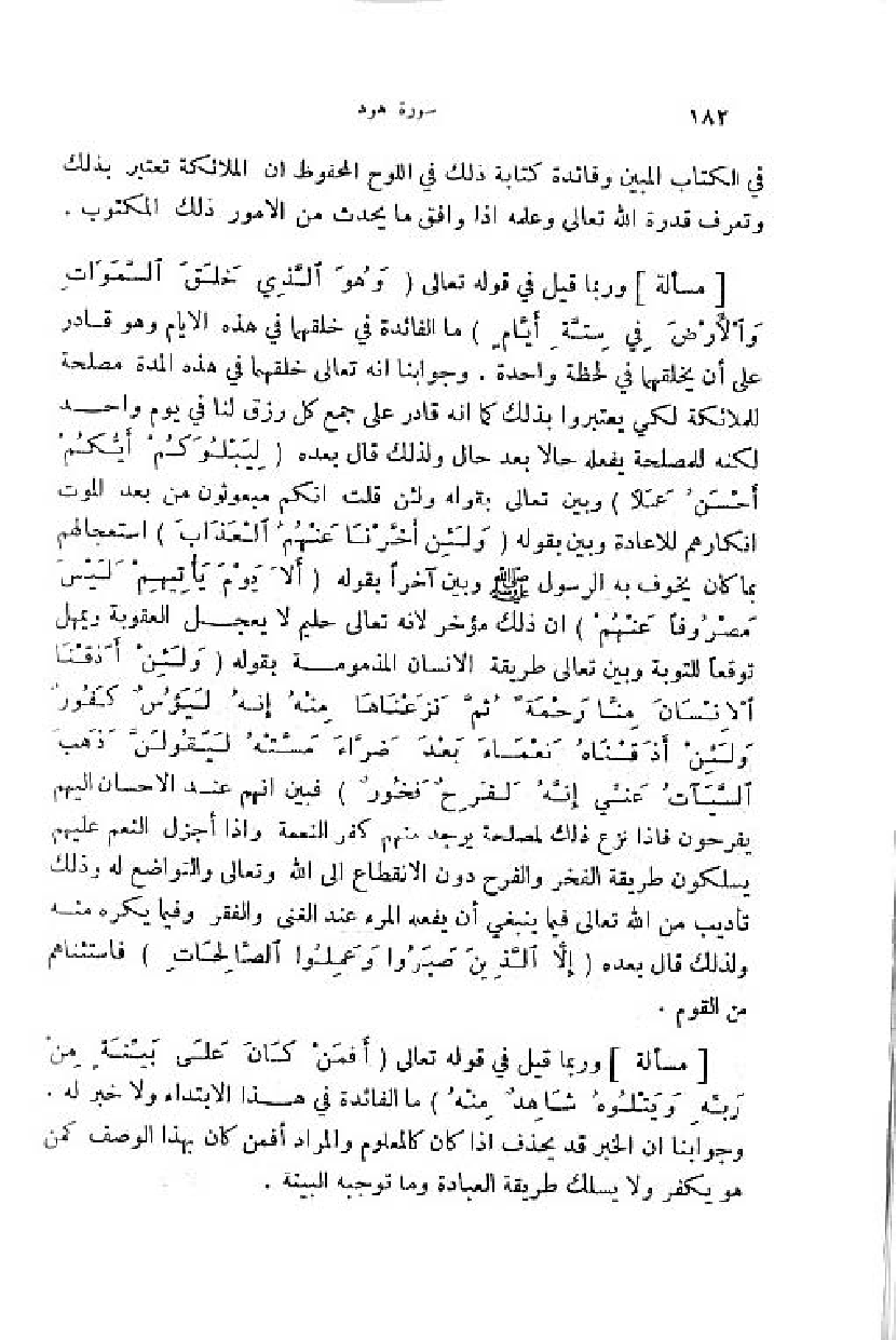 وربما قيل في قوله تعالى (وَ هُوَ الَّذِي خَلَقَ السَّماواتِ والْأَرْضَ فِي سِتَّةِ أَيَّامٍ) ما الفائدة في خلقهما في هذه الايام وهو قادر على أن يخلقهما في لحظة واحدة. وجوابنا انه تعالى خلقهما في هذه المدة مصلحة للملائكة لكي يعتبروا بذلك كما انه قادر على جمع كل رزق لنا في يوم واحد لكنه للمصلحة يفعله حالا بعد حال ولذلك قال بعده (لِيَبْلُوَكُمْ أَيُّكُمْ أَحْسَنُ عَمَلًا) وبين تعالى بقوله ولئن قلت انكم مبعوثون من بعد الموت انكارهم للاعادة وبين بقوله (وَ لَئِنْ أَخَّرْنا عَنْهُمُ الْعَذابَ) استعجالهم بما كان يخوف به الرسول صلّى اللّه عليه وسلم وبين آخرا بقوله (أَلا يَوْمَ يَأْتِيهِمْ لَيْسَ مَصْرُوفاً عَنْهُمْ) ان ذلك مؤخر لانه تعالى حليم لا يعجل العقوبة ويمهل توقعا للتوبة وبين تعالى طريقة الانسان المذمومة بقوله (وَ لَئِنْ أَذَقْنَا الْإِنْسانَ مِنَّا رَحْمَةً ثُمَّ نَزَعْناها مِنْهُ إِنَّهُ لَيَؤُسٌ كَفُورٌ ولَئِنْ أَذَقْناهُ نَعْماءَ بَعْدَ ضَرَّاءَ مَسَّتْهُ لَيَقُولَنَّ ذَهَبَ السَّيِّئاتُ عَنِّي إِنَّهُ لَفَرِحٌ فَخُورٌ) فبين انهم عند الاحسان اليهم يفرحون فاذا نزع ذلك لمصلحة يوجد منهم كفر النعمة واذا أجزل النعم عليهم يسلكون طريقة الفخر والفرح دون الانقطاع الى اللّه وتعالى والتواضع له وذلك تأديب من اللّه تعالى فيما ينبغي أن يفعله المرء عند الغنى والفقر وفيما يكره منه ولذلك قال بعده (إِلَّا الَّذِينَ صَبَرُوا وعَمِلُوا الصَّالِحاتِ) فاستثناهم من القوم.