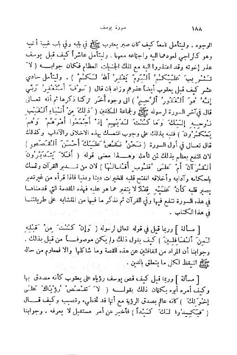 الوجوه. وليتأمل تاسعا كيف كان صبر يعقوب صلّى اللّه عليه وسلم في بابه وفي باب غيبة أخيه وهو كالراجي لعودهما اليه واجتماعه معهما. وليتأمل عاشرا كيف قبل يوسف عذر إخوته وقد اعتذروا اليه مع تلك الجنايات العظام فكان جوابه (لا تَثْرِيبَ عَلَيْكُمُ الْيَوْمَ يَغْفِرُ اللَّهُ لَكُمْ). وليتأمل حادي عشر كيف قبل يعقوب أيضا عذرهم وزاد بان قال (سَوْفَ أَسْتَغْفِرُ لَكُمْ رَبِّي إِنَّهُ هُوَ الْغَفُورُ الرَّحِيمُ) الى وجوه أخر تركنا ذكرها ثمّ أنه تعالى قال في آخر السورة لرسوله صلّى اللّه عليه وسلم ولجماعة المكلفين (ذلِكَ مِنْ أَنْباءِ الْغَيْبِ نُوحِيهِ إِلَيْكَ وما كُنْتَ لَدَيْهِمْ إِذْ أَجْمَعُوا أَمْرَهُمْ وهُمْ يَمْكُرُونَ) فنبه بذلك على وجوب التمسك بهذه الاخلاق والآداب وكذلك قال تعالى في أول السورة (نَحْنُ نَقُصُّ عَلَيْكَ أَحْسَنَ الْقَصَصِ) لان النفع يعظم بذلك لمن تأمله وهذا معنى قوله (أَ فَلا يَتَدَبَّرُونَ الْقُرْآنَ أَمْ عَلى قُلُوبٍ أَقْفالُها) لان من تدبر القرآن وتمسك باحكامه وآدابه وأخلاقه انفتح قلبه للخيرات دينا ودنيا فاذا قرأه من غير تدبر يصير قلبه كأنّ عليه قفلا لا يتغير عما هو عليه فهذه المقدمة التي قدمناها في هذه السورة تنفع فيها وفي القرآن ثمّ نذكر ما فيها من المتشابه على طريقتنا في هذا الكتاب.