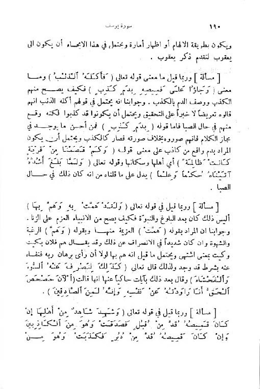 وربما قيل ما معنى قوله تعالى (فَأَكَلَهُ الذِّئْبُ) وما معنى (وَ جاؤُ عَلى قَمِيصِهِ بِدَمٍ كَذِبٍ) فكيف يصح منهم الكذب ووصف الدم بالكذب. وجوابنا انه يحتمل في قولهم أكله الذئب انهم قالوه تعريضا لا خبرا على التحقيق ويحتمل أن يكونوا قد كذبوا لكنه وقع منهم في حال الصبا فاما قوله (بِدَمٍ كَذِبٍ) فمن أحسن ما يوجد في مجاز الكلام فانهم صوروه بخلاف صورته فصار كالكذب ويحتمل أن يكون المراد بدم واقع من كاذب على معنى قوله (وَ كَمْ قَصَمْنا مِنْ قَرْيَةٍ كانَتْ ظالِمَةً) أي أهلها وسكانها وقوله تعالى (وَ لَمَّا بَلَغَ أَشُدَّهُ آتَيْناهُ حُكْماً وعِلْماً) يدل على ما قلناه من انه كان ذلك في حال الصبا.