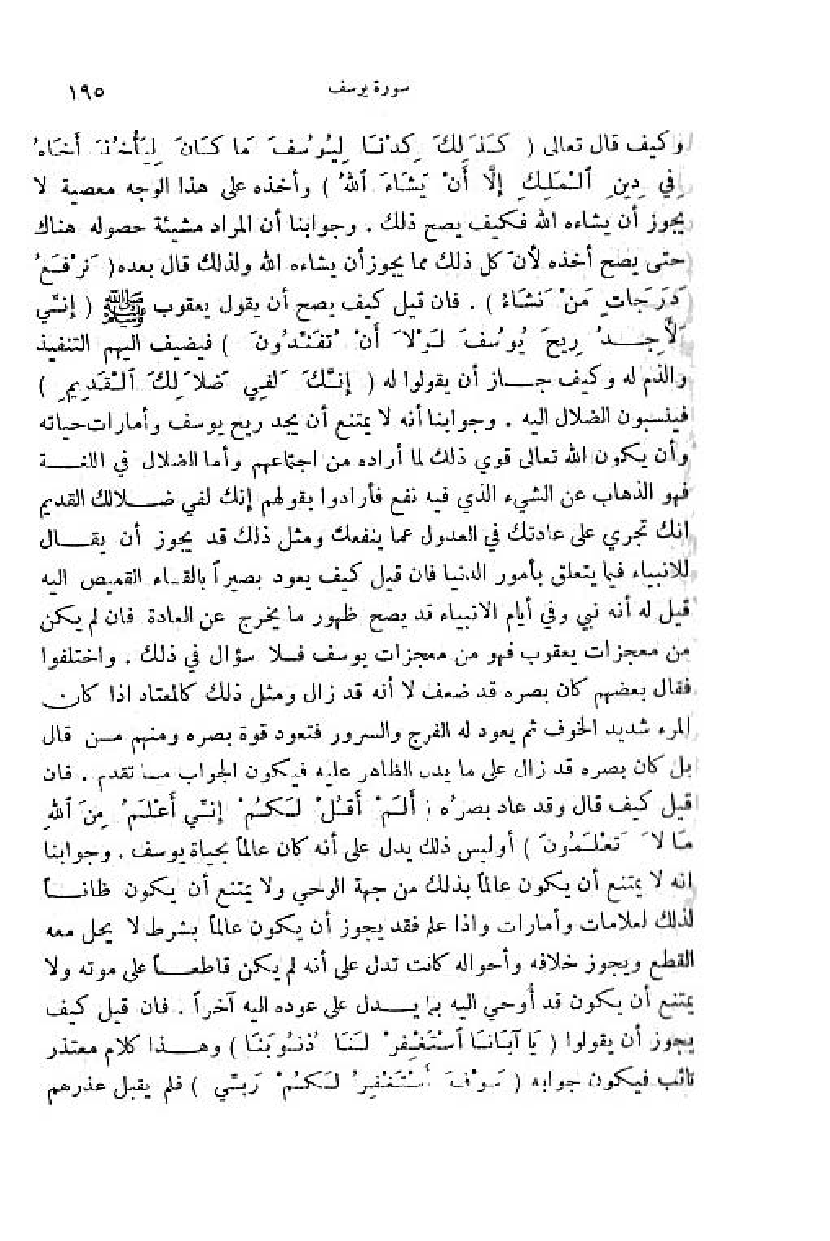 وكيف قال تعالى (كَذلِكَ كِدْنا لِيُوسُفَ ما كانَ لِيَأْخُذَ أَخاهُ فِي دِينِ الْمَلِكِ إِلَّا أَنْ يَشاءَ اللَّهُ) وأخذه على هذا الوجه معصية لا يجوز أن يشاءه اللّه فكيف يصح ذلك. وجوابنا أن المراد مشيئة حصوله هناك حتى يصح أخذه لأنّ كل ذلك مما يجوز أن يشاءه اللّه ولذلك قال بعده (نَرْفَعُ دَرَجاتٍ مَنْ نَشاءُ). فان قيل كيف يصح أن يقول يعقوب صلّى اللّه عليه وسلم (إِنِّي لَأَجِدُ رِيحَ يُوسُفَ لَوْ لا أَنْ تُفَنِّدُونِ) فيضيف اليهم التنفيذ والذم له وكيف جاز أن يقولوا له (إِنَّكَ لَفِي ضَلالِكَ الْقَدِيمِ) فينسبون الضلال اليه. وجوابنا أنه لا يمتنع أن يجد ريح يوسف وأمارات حياته وأن يكون اللّه تعالى قوي ذلك لما أراده من اجتماعهم وأما الضلال في اللغة فهو الذهاب عن الشيء الذي فيه نفع فأرادوا بقولهم إنك لفي ضلالك القديم انك تجري على عادتك في العدول عما ينفعك ومثل ذلك قد يجوز أن يقال للانبياء فيما يتعلق بأمور الدنيا فان قيل كيف يعود بصيرا بالقاء القميص اليه قيل له أنه نبي وفي أيام الانبياء قد يصح ظهور ما يخرج عن العادة فان لم يكن من معجزات يعقوب فهو من معجزات يوسف فلا سؤال في ذلك. واختلفوا فقال بعضهم كان بصره قد ضعف لا أنه قد زال ومثل ذلك كالمعتاد اذا كان المرء شديد الخوف ثمّ يعود له الفرج والسرور فتعود قوة بصره ومنهم من قال بل كان بصره قد زال على ما يدل الظاهر عليه فيكون الجواب ما تقدم. فان قيل كيف قال وقد عاد بصره (أَ لَمْ أَقُلْ لَكُمْ إِنِّي أَعْلَمُ مِنَ اللَّهِ ما لا تَعْلَمُونَ) أو ليس ذلك يدل على أنه كان عالما بحياة يوسف. وجوابنا انه لا يمتنع أن يكون عالما بذلك من جهة الوحي ولا يمتنع أن يكون ظانا لذلك لعلامات وأمارات واذا علم فقد يجوز أن يكون عالما بشرط لا يحل معه القطع ويجوز خلافه وأحواله كانت تدل على أنه لم يكن قاطعا على موته ولا يمتنع أن يكون قد أوحي اليه بما يدل على عوده اليه آخرا. فان قيل كيف يجوز أن يقولوا (يا أَبانَا اسْتَغْفِرْ لَنا ذُنُوبَنا) وهذا كلام معتذر تائب فيكون جوابه (سَوْفَ أَسْتَغْفِرُ لَكُمْ رَبِّي) فلم يقبل عذرهم