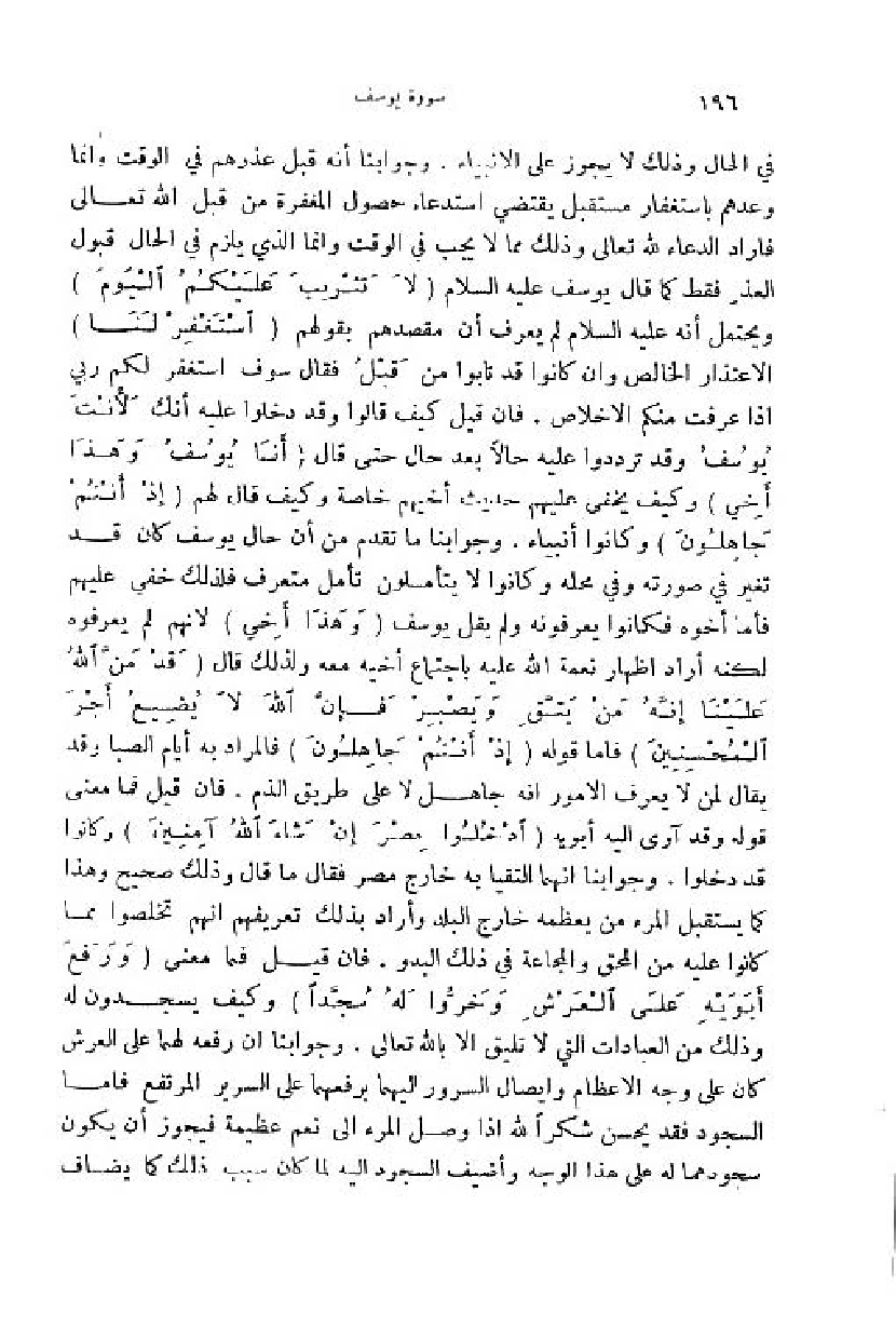 في الحال وذلك لا يجوز على الانبياء. وجوابنا أنه قبل عذرهم في الوقت وانما وعدهم باستغفار مستقبل يقتضي استدعاء حصول المغفرة من قبل اللّه تعالى فاراد الدعاء للّه تعالى وذلك مما لا يجب في الوقت وانما الذي يلزم في الحال قبول العذر فقط كما قال يوسف عليه السلام (لا تَثْرِيبَ عَلَيْكُمُ الْيَوْمَ) ويحتمل أنه عليه السلام لم يعرف أن مقصدهم بقولهم (اسْتَغْفِرْ لَنا) الاعتذار الخالص وان كانوا قد تابوا من قبل فقال سوف استغفر لكم ربي اذا عرفت منكم الاخلاص. فان قيل كيف قالوا وقد دخلوا عليه أنك لأنت يوسف وقد ترددوا عليه حالا بعد حال حتى قال (أَنَا يُوسُفُ وهذا أَخِي) وكيف يخفى عليهم حديث أخيهم خاصة وكيف قال لهم (إِذْ أَنْتُمْ جاهِلُونَ) وكانوا أنبياء. وجوابنا ما تقدم من أن حال يوسف كان قد تغير في صورته وفي محله وكانوا لا يتأملون تأمل متعرف فلذلك خفى عليهم فأما أخوه فكانوا يعرفونه ولم يقل يوسف (وَ هذا أَخِي) لانهم لم يعرفوه لكنه أراد اظهار نعمة اللّه عليه باجتماع أخيه معه ولذلك قال (قَدْ مَنَّ اللَّهُ عَلَيْنا إِنَّهُ مَنْ يَتَّقِ ويَصْبِرْ فَإِنَّ اللَّهَ لا يُضِيعُ أَجْرَ الْمُحْسِنِينَ) فاما قوله (إِذْ أَنْتُمْ جاهِلُونَ) فالمراد به أيام الصبا وقد يقال لمن لا يعرف الامور انه جاهل لا على طريق الذم. فان قيل فما معنى قوله وقد آوى اليه أبويه (ادْخُلُوا مِصْرَ إِنْ شاءَ اللَّهُ آمِنِينَ) وكانوا قد دخلوا. وجوابنا انهما التقيا به خارج مصر فقال ما قال وذلك صحيح وهذا كما يستقبل المرء من يعظمه خارج البلد وأراد بذلك تعريفهم انهم تخلصوا مما كانوا عليه من المحق والمجاعة في ذلك البدو. فان قيل فما معنى (وَ رَفَعَ أَبَوَيْهِ عَلَى الْعَرْشِ وخَرُّوا لَهُ سُجَّداً) وكيف يسجدون له وذلك من العبادات التي لا تليق الا باللّه تعالى. وجوابنا ان رفعه لهما على العرش كان على وجه الاعظام وايصال السرور اليهما برفعهما على السرير المرتفع فاما السجود فقد يحسن شكرا للّه اذا وصل المرء الى نعم عظيمة فيجوز أن يكون سجودهما له على هذا الوجه وأضيف السجود اليه لما كان سبب ذلك كما يضاف